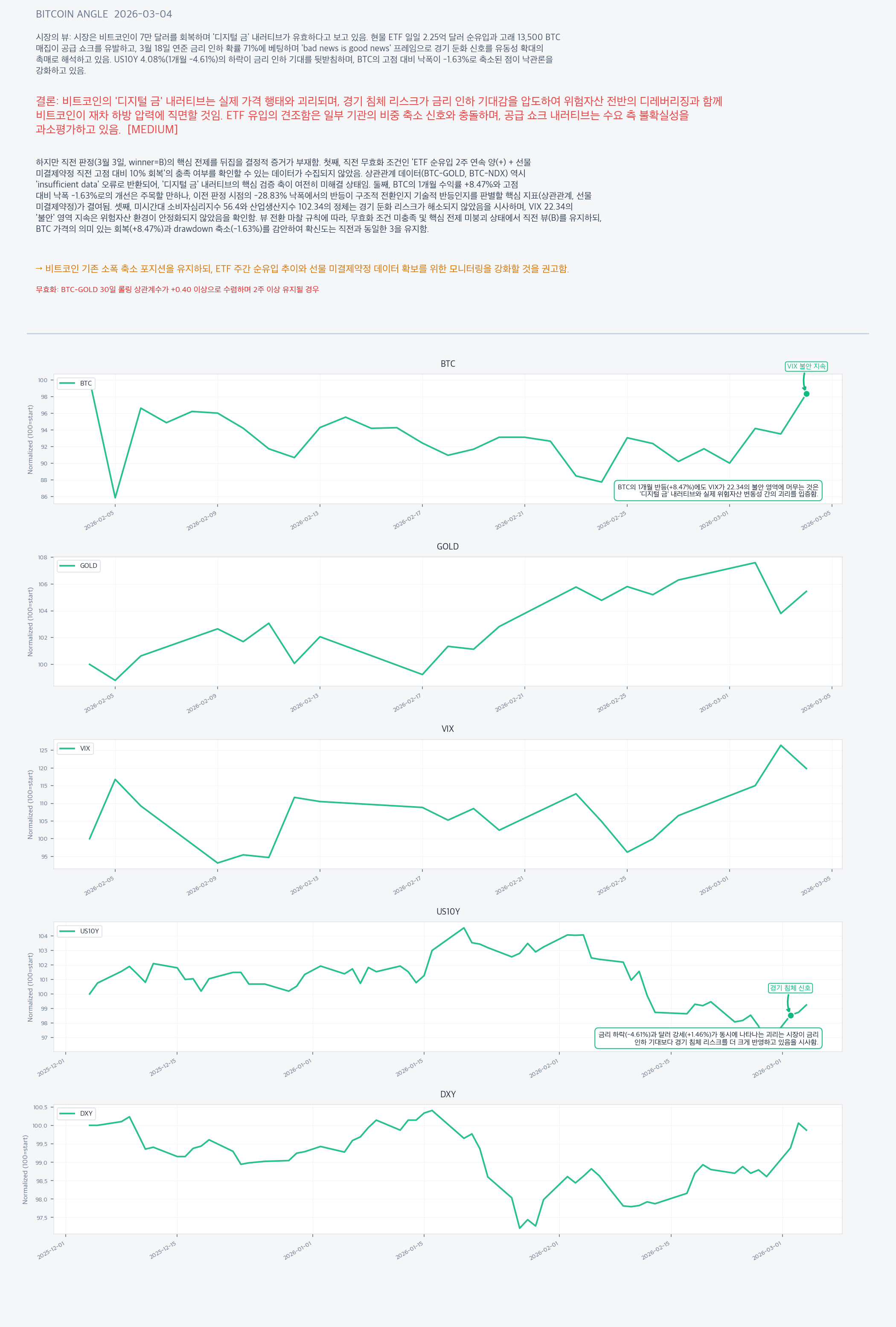 하지만 직전 판정(3월 3일, winner=B)의 핵심 전제를 뒤집을 결정적 증거가 부재함. 첫째, 직전 무효화 조건인 'ETF 순유입 2주 연속 양(+) + 선물 미결제약정 직전 고점 대비 10% 회복'의 충족 여부를 확인할 수 있는 데이터가 수집되지 않았음. 상관관계 데이터(BTC-GOLD, BTC-NDX) 역시 'insufficient data' 오류로 반환되어, '디지털 금' 내러티브의 핵심 검증 축이 여전히 미해결 상태임. 둘째, BTC의 1개월 수익률 +8.47%와 고점 대비 낙폭 -1.63%로의 개선은 주목할 만하나, 이전 판정 시점의 -28.83% 낙폭에서의 반등이 구조적 전환인지 기술적 반등인지를 판별할 핵심 지표(상관관계, 선물 미결제약정)가 결여됨. 셋째, 미시간대 소비자심리지수 56.4와 산업생산지수 102.34의 정체는 경기 둔화 리스크가 해소되지 않았음을 시사하며, VIX 22.34의 '불안' 영역 지속은 위험자산 환경이 안정화되지 않았음을 확인함. 뷰 전환 마찰 규칙에 따라, 무효화 조건 미충족 및 핵심 전제 미붕괴 상태에서 직전 뷰(B)를 유지하되, BTC 가격의 의미 있는 회복(+8.47%)과 drawdown 축소(-1.63%)를 감안하여 확신도는 직전과 동일한 3을 유지함.