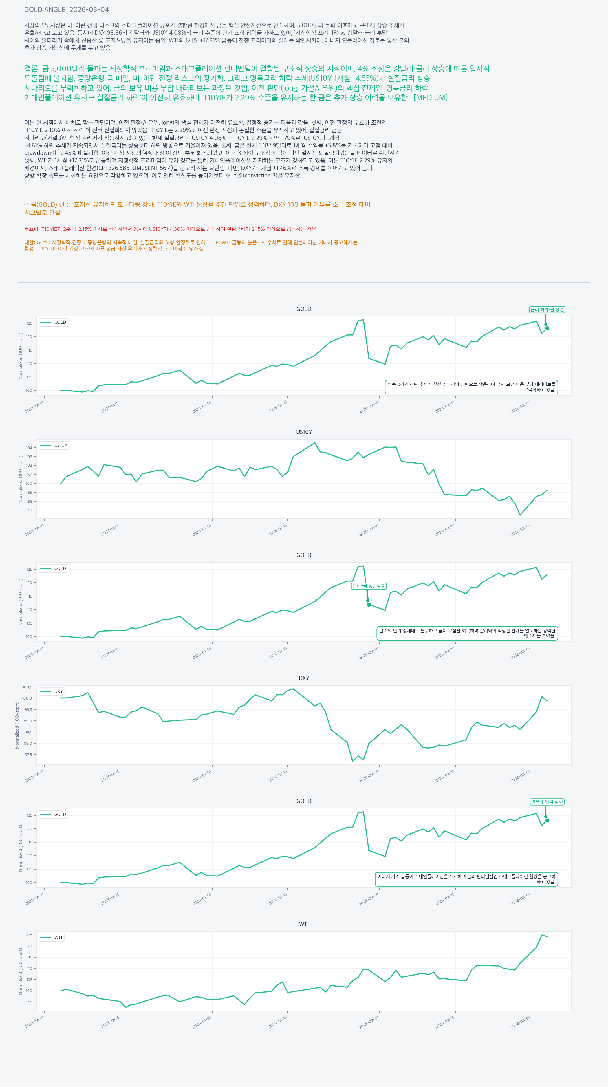 금(GOLD) 현 롱 포지션 유지하되 모니터링 강화. T10YIE와 WTI 동향을 주간 단위로 점검하며, DXY 100 돌파 여부를 소폭 조정 대비 시그널로 관찰.