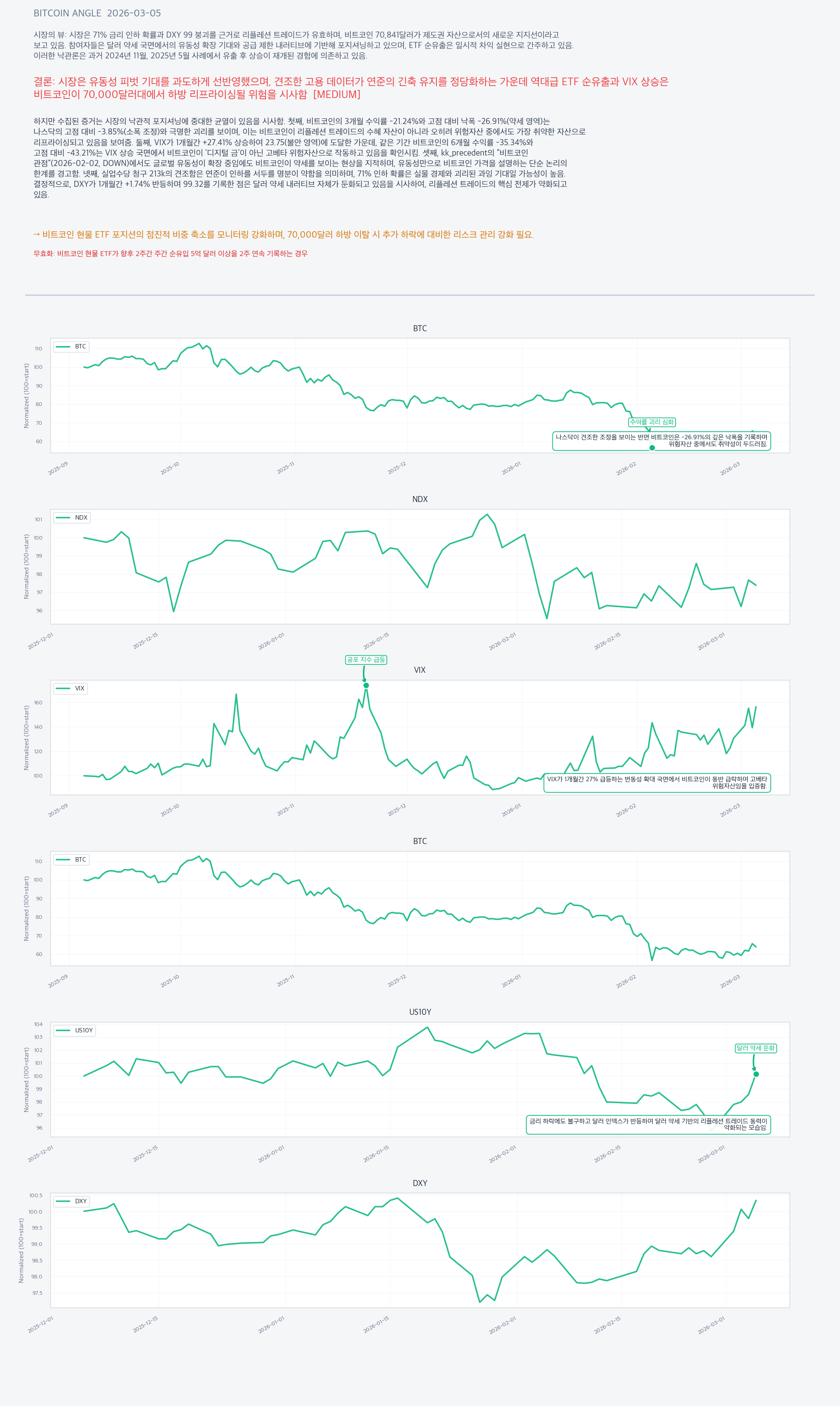 비트코인 현물 ETF 포지션의 점진적 비중 축소를 모니터링 강화하며, 70,000달러 하방 이탈 시 추가 하락에 대비한 리스크 관리 강화 필요.