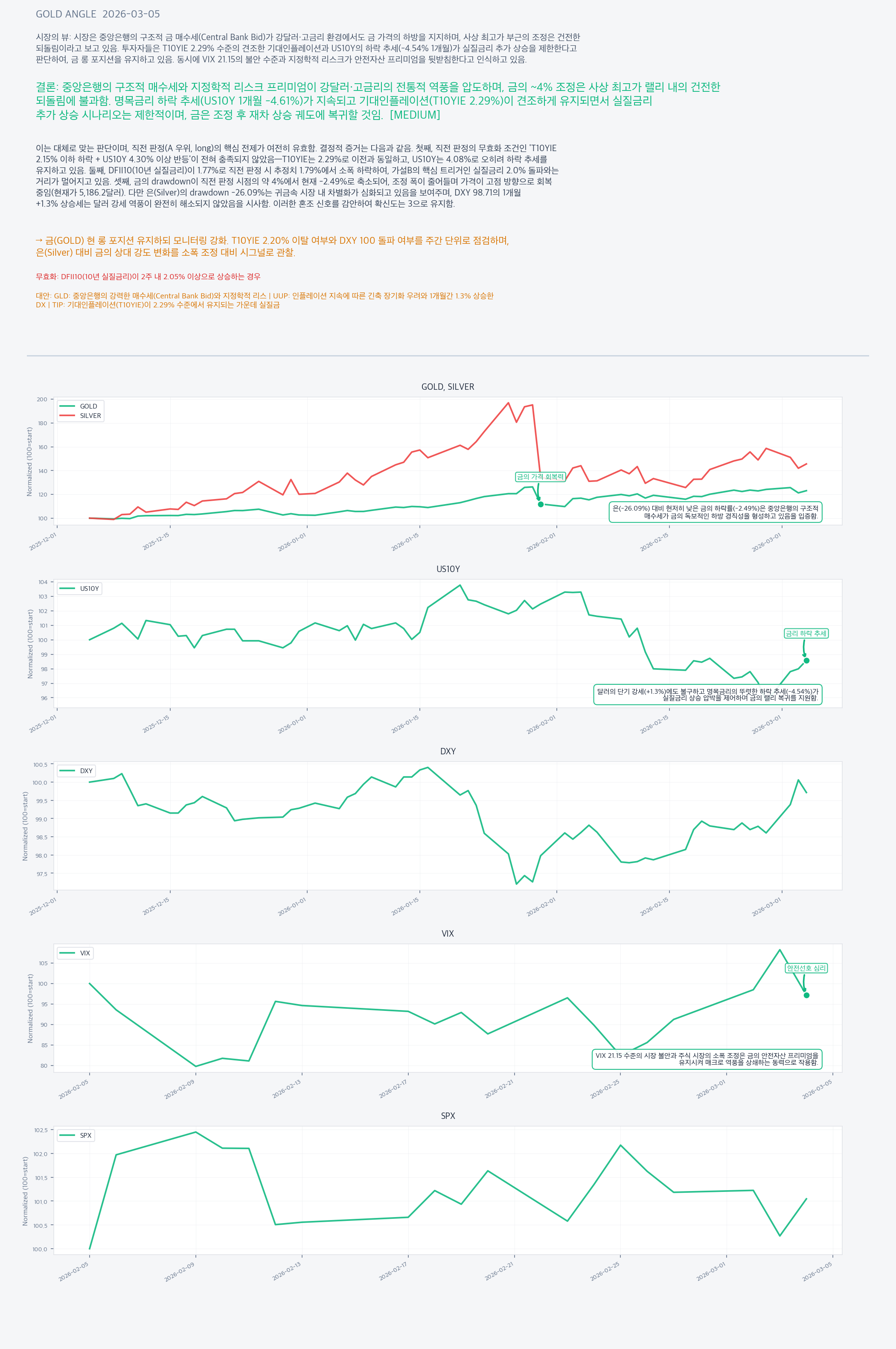 금(GOLD) 현 롱 포지션 유지하되 모니터링 강화. T10YIE 2.20% 이탈 여부와 DXY 100 돌파 여부를 주간 단위로 점검하며, 은(Silver) 대비 금의 상대 강도 변화를 소폭 조정 대비 시그널로 관찰.