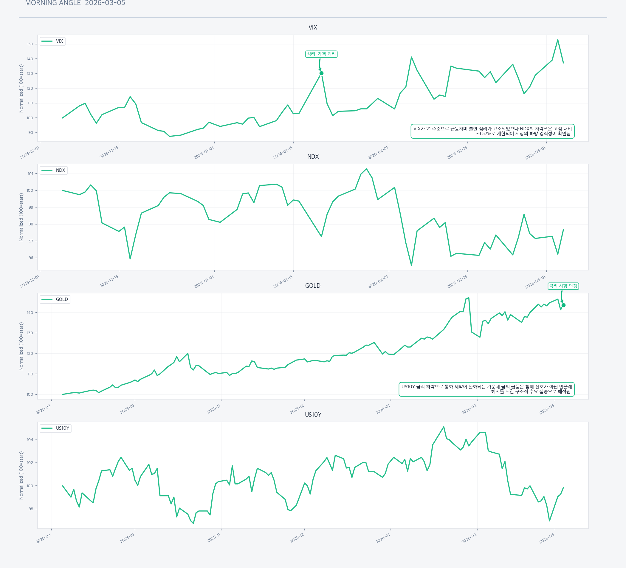 중동 분쟁과 VIX 상승에 따른 지정학적 위험 회피 수요가 지속되는 가운데, 국채 금리 하락 추세로 인해 금 보유의 실질적 기회비용이 감소하며 수혜를 받음.