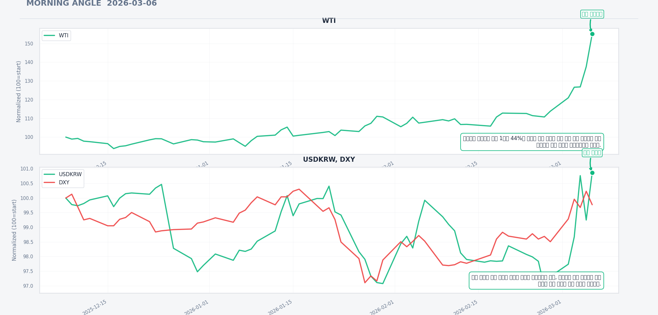 하지만 현재 수집된 실물 경제 증거는 시장의 극단적 공포 프라이싱을 정당화하기에 불충분함. 결정적으로, ICSA 21.3만 건은 역사적 저수준을 유지하고 있어 고용 시장의 균열 신호가 전혀 포착되지 않음. 이는 기업들이 대규모 구조조정에 돌입하지 않았음을 의미하며, 소비 지출의 급격한 붕괴 시나리오의 전제 조건이 충족되지 않음. T10Y2Y 스프레드 0.56의 양수 전환이 역사적으로 침체 진입 직전 신호라는 가설 A의 논리는 유효하나, 그 시차가 통상 6~18개월에 걸치므로 향후 4~6주 내 급격한 실물 악화를 뒷받침하지는 못함. WTI의 1개월 +44.26% 급등과 연환산 변동성 58.03%는 극단적 스파이크 패턴을 보이며, RAG 검색 결과에서 확인되듯 지정학적 이슈에 의한 유가 상승은 '일시적 이슈'로 분류되는 사례가 다수임. INDPRO 102.3의 장기 정체는 경기가 '둔화' 국면이지 '붕괴' 국면이 아님을 시사하며, 수요가 이미 약화된 환경에서 유가 상승의 인플레이션 전이 효과는 수요 파괴를 통한 자기 조정 메커니즘에 의해 제한될 가능성이 높음. USDKRW(1개월 +0.95%)와 DXY(1개월 +1.07%)의 움직임이 거의 동조화되어 있어, 원화 약세는 한국 특수 리스크보다는 달러 강세의 글로벌 현상에 기인한 것으로 판단됨.