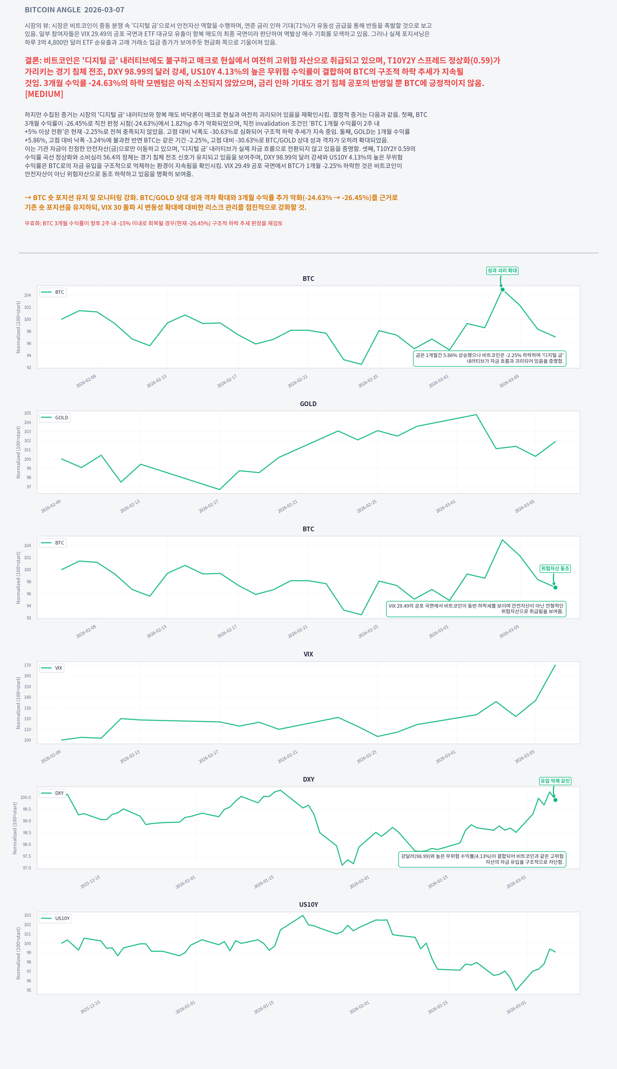 BTC 숏 포지션 유지 및 모니터링 강화. BTC/GOLD 상대 성과 격차 확대와 3개월 수익률 추가 악화(-24.63% → -26.45%)를 근거로 기존 숏 포지션을 유지하되, VIX 30 돌파 시 변동성 확대에 대비한 리스크 관리를 점진적으로 강화할 것.