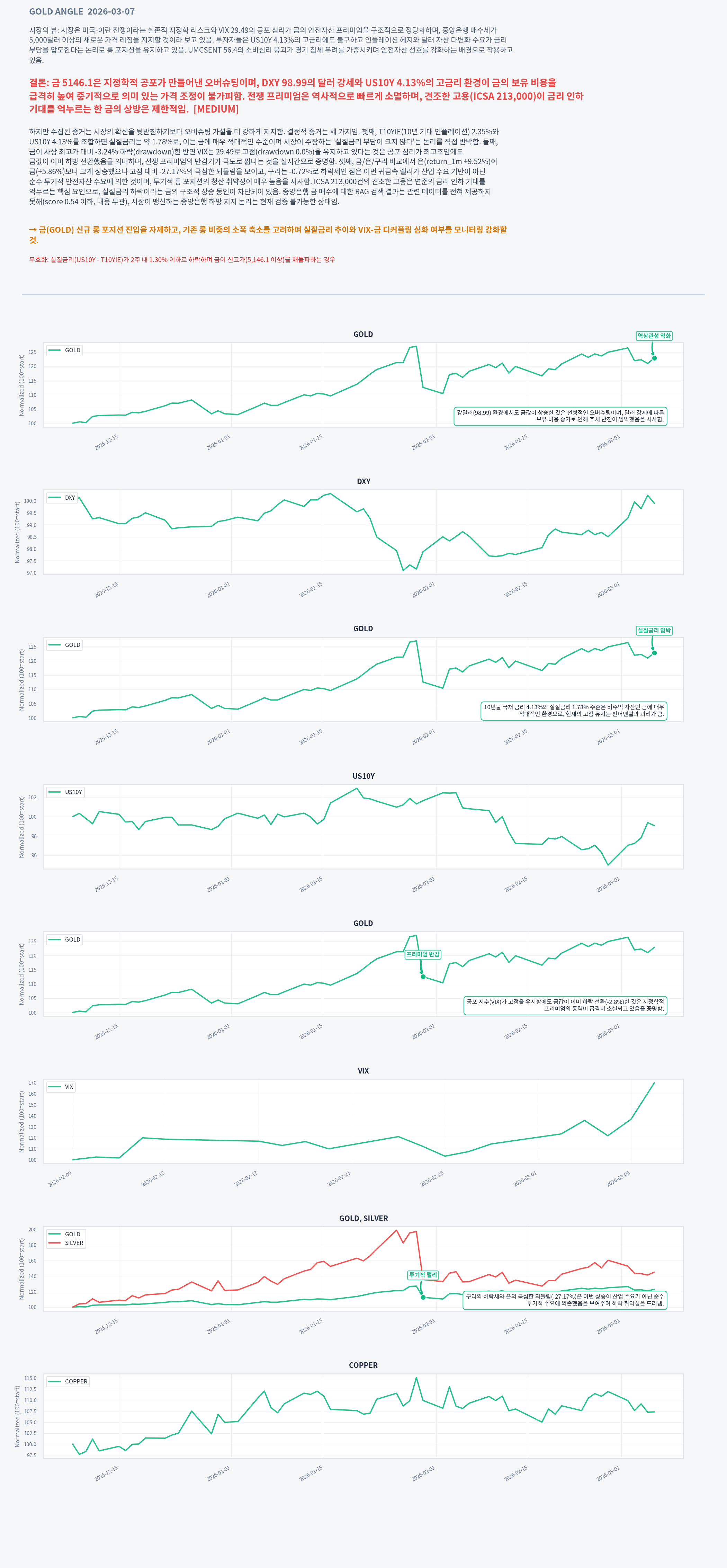 실질금리(US10Y - T10YIE)가 2주 내 1.30% 이하로 하락하며 금이 신고가(5,146.1 이상)를 재돌파하는 경우