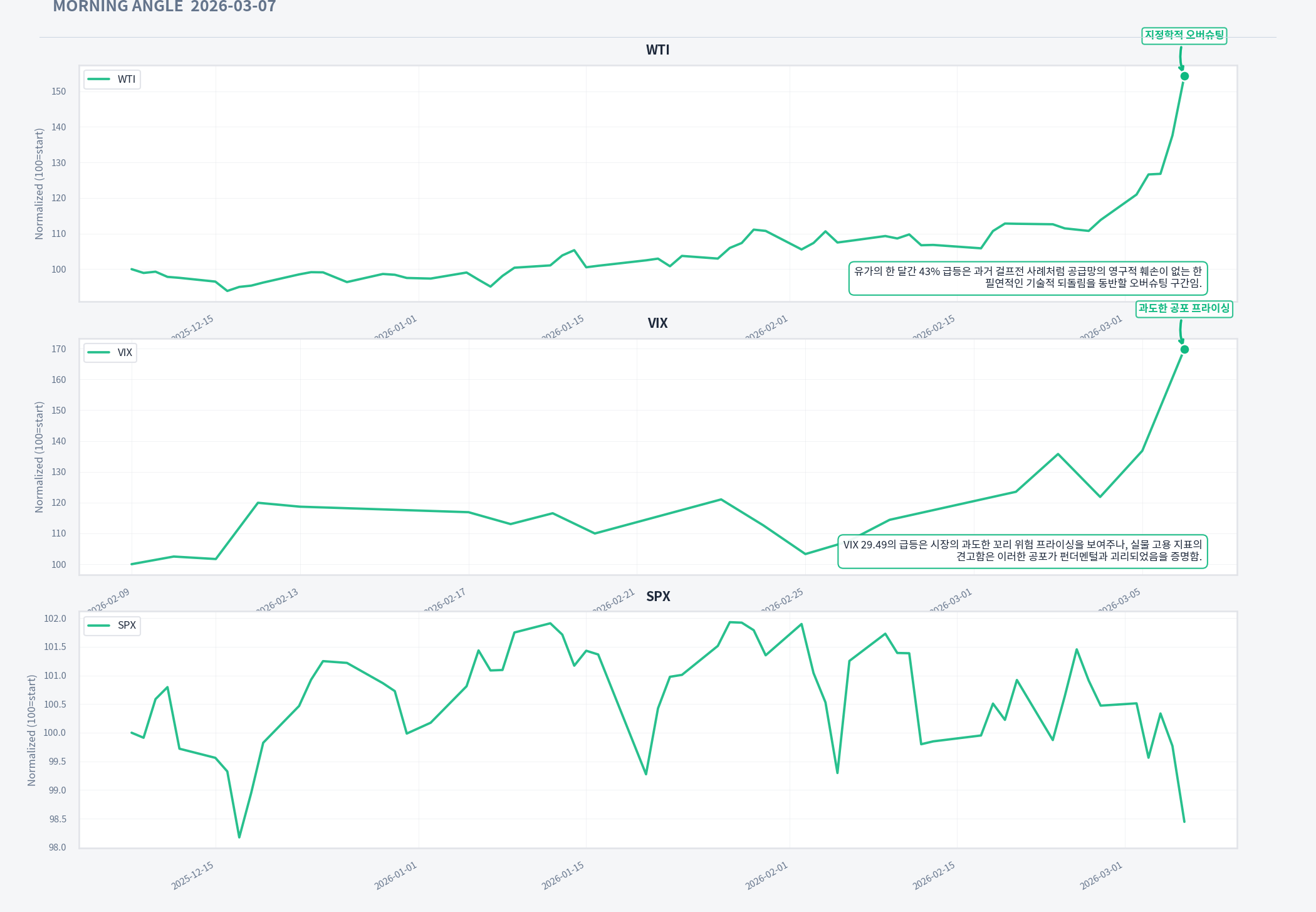 유가 폭등과 VIX 29.49(공포) 진입을 근거로 경기 침체 속 물가 상승(스태그플레이션)이 기정사실화됨
