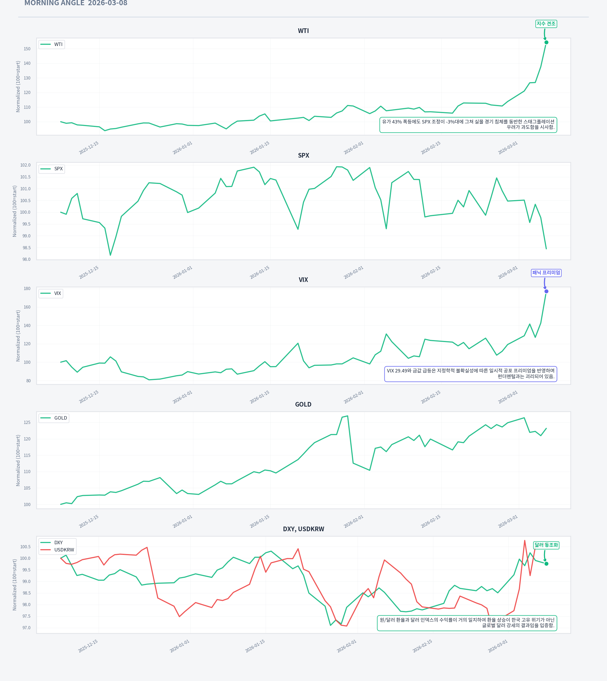 하지만 현재 수집된 증거는 시장의 스태그플레이션 공포 프라이싱을 정당화하기에 여전히 불충분함. 가장 결정적인 증거는 ICSA가 21.3만 건으로 직전 판정(3/7) 시점과 동일한 역사적 저수준을 유지하고 있으며, 직전 판정에서 설정한 무효화 조건인 'ICSA 4주 내 2주 연속 25만 건 상회'가 트리거되지 않았다는 점임. 스태그플레이션의 '스태그(침체)' 측면이 고용 데이터에서 전혀 포착되지 않는 한, 유가 급등만으로 레짐 전환을 선언할 수 없음. WTI 1개월 수익률 +43.62%의 급등에도 불구하고 SPX는 고점 대비 -3.42%(소폭 조정 수준)에 그치고 있어, 주식시장 자체가 실물 경제 붕괴를 반영하고 있지 않음. 원/달러 환율(1,481원)과 DXY(98.86)의 1개월 수익률이 각각 +1.28%, +1.25%로 거의 동조하고 있어, 원화 약세가 한국 고유의 시스템 위기가 아닌 글로벌 달러 강세의 결과임이 확인됨. T10Y2Y 스프레드 +0.59는 직전 판정(+0.56) 대비 소폭 확대되어, 채권시장이 임박한 침체가 아닌 성장 지속을 반영하고 있음. 다만, VIX 29.49(공포 구간)와 UMCSENT 56.4의 저수준 소비자심리는 향후 실물 전이 가능성을 경고하는 선행 신호로서, 확신도를 높이지 못하는 핵심 제약 요인임.
