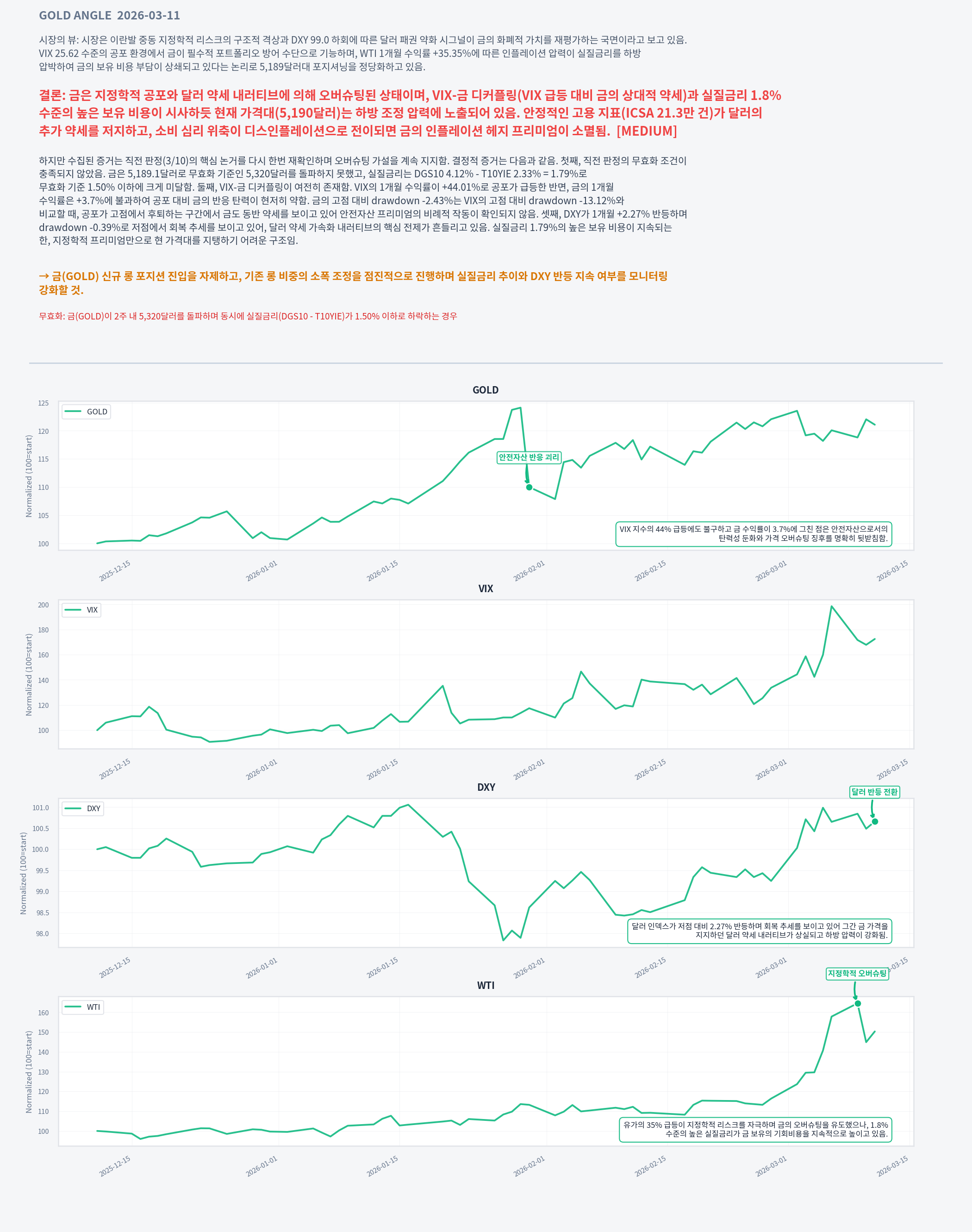하지만 수집된 증거는 직전 판정(3/10)의 핵심 논거를 다시 한번 재확인하며 오버슈팅 가설을 계속 지지함. 결정적 증거는 다음과 같음. 첫째, 직전 판정의 무효화 조건이 충족되지 않았음. 금은 5,189.1달러로 무효화 기준인 5,320달러를 돌파하지 못했고, 실질금리는 DGS10 4.12% - T10YIE 2.33% = 1.79%로 무효화 기준 1.50% 이하에 크게 미달함. 둘째, VIX-금 디커플링이 여전히 존재함. VIX의 1개월 수익률이 +44.01%로 공포가 급등한 반면, 금의 1개월 수익률은 +3.7%에 불과하여 공포 대비 금의 반응 탄력이 현저히 약함. 금의 고점 대비 drawdown -2.43%는 VIX의 고점 대비 drawdown -13.12%와 비교할 때, 공포가 고점에서 후퇴하는 구간에서 금도 동반 약세를 보이고 있어 안전자산 프리미엄의 비례적 작동이 확인되지 않음. 셋째, DXY가 1개월 +2.27% 반등하며 drawdown -0.39%로 저점에서 회복 추세를 보이고 있어, 달러 약세 가속화 내러티브의 핵심 전제가 흔들리고 있음. 실질금리 1.79%의 높은 보유 비용이 지속되는 한, 지정학적 프리미엄만으로 현 가격대를 지탱하기 어려운 구조임.
