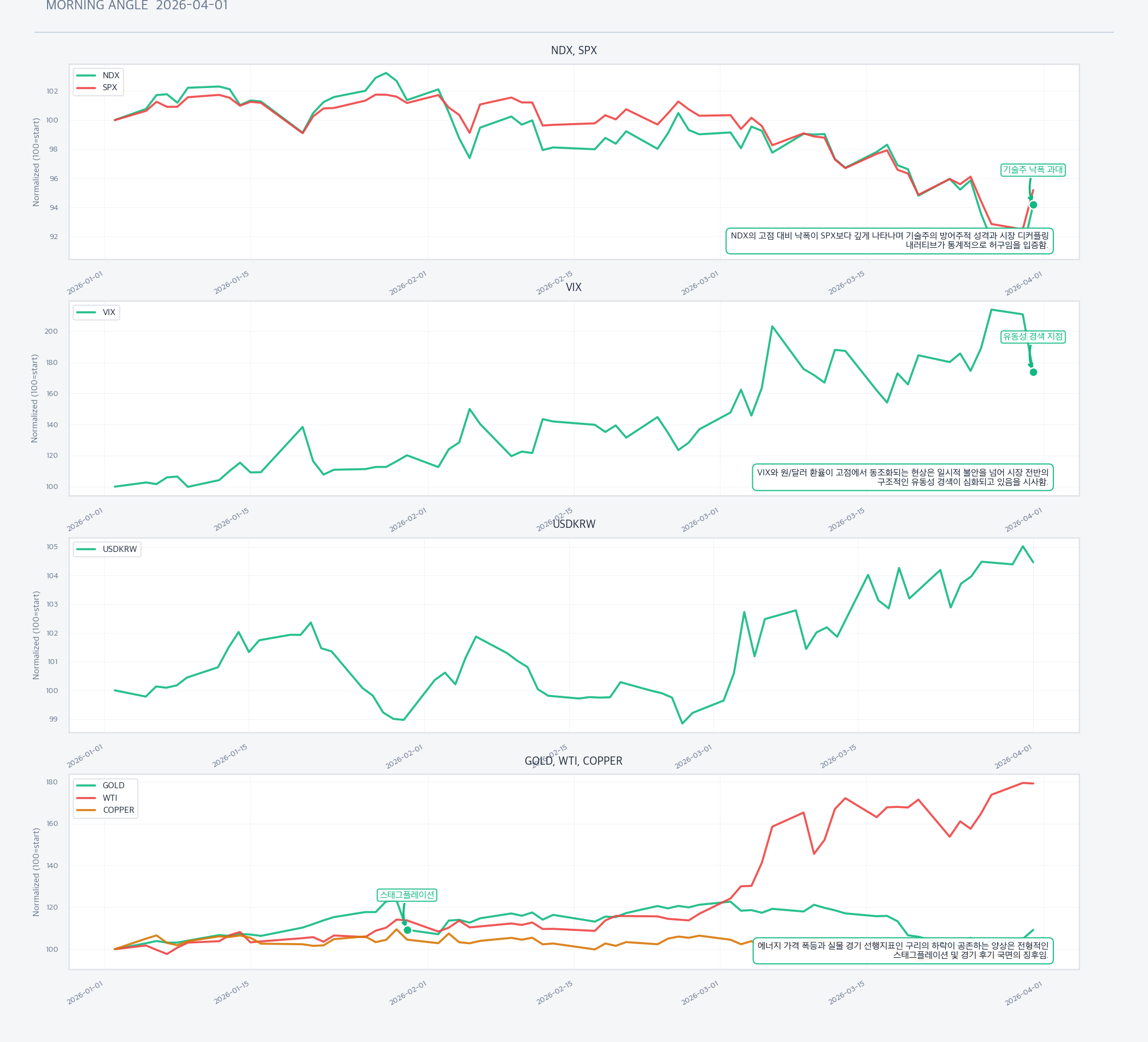 시장 관점: 시장은 NDX의 상대적 견조함(-3.96% 1개월 수익률)을 AI·빅테크의 구조적 이익 성장이 매크로 둔화를 상쇄하는 '디커플링'으로 해석하고 있으며, ICSA 21.0만 건의 역사적 저점을 근거로 경기 침체가 아닌 성장 둔화 속 선별적 강세 국면으로 판단하고 있음. 금과 유가의 급등은 공급 측 충격의 합리적 반영으로, 연준의 금리 동결은 이를 인내하겠다는 시그널로 받아들이며 위험자산 내 '품질 선별(Quality Rally)' 포지셔닝을 유지하고 있음.
