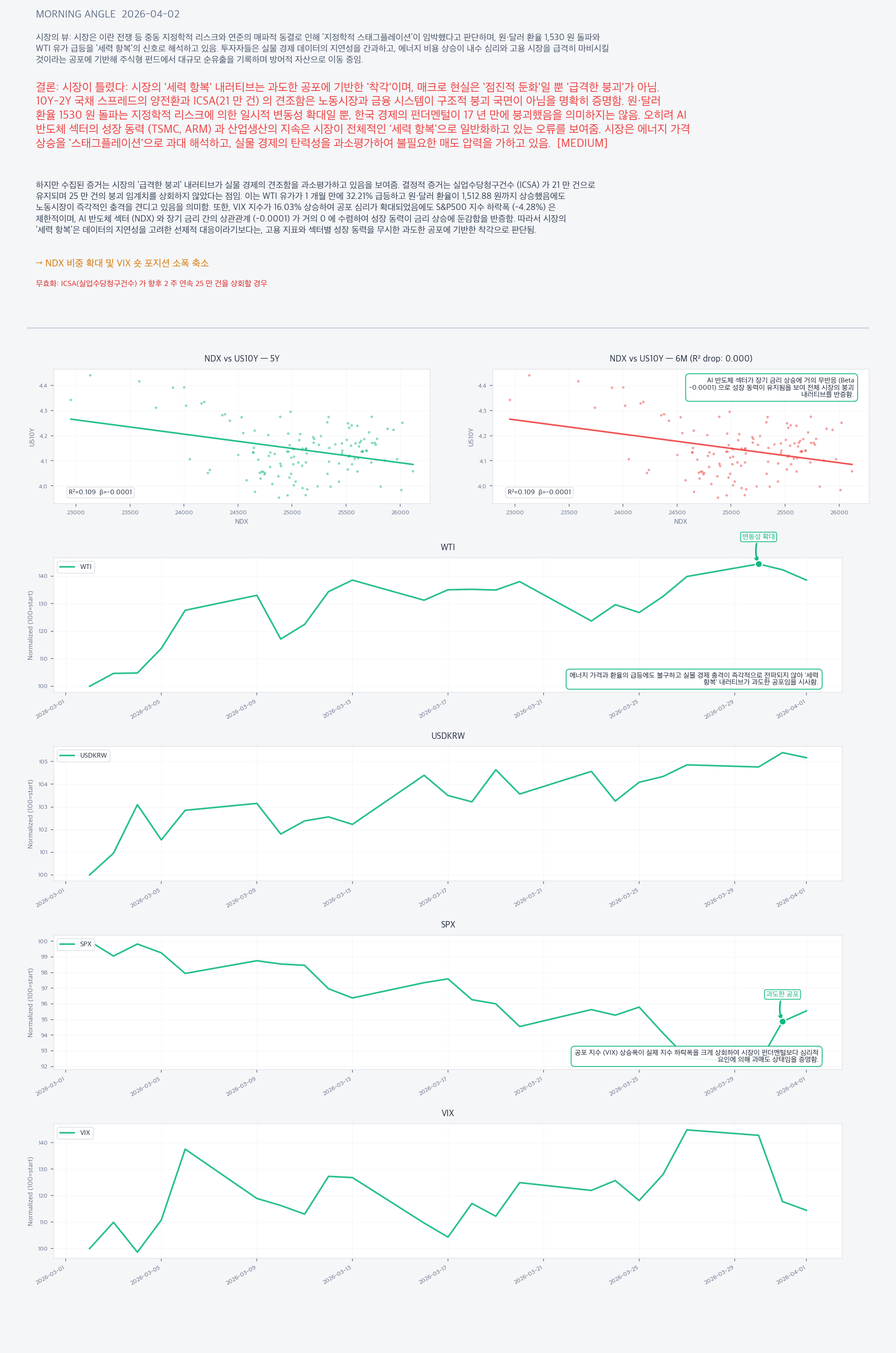 시장이 틀렸다: 시장의 '세력 항복' 내러티브는 과도한 공포에 기반한 '착각'이며, 매크로 현실은 '점진적 둔화'일 뿐 '급격한 붕괴'가 아님. 10Y-2Y 국채 스프레드의 양전환과 ICSA(21 만 건) 의 견조함은 노동시장과 금융 시스템이 구조적 붕괴 국면이 아님을 명확히 증명함. 원·달러 환율 1530 원 돌파는 지정학적 리스크에 의한 일시적 변동성 확대일 뿐, 한국 경제의 펀더멘털이 17 년 만에 붕괴했음을 의미하지는 않음. 오히려 AI 반도체 섹터의 성장 동력 (TSMC, ARM) 과 산업생산의 지속은 시장이 전체적인 '세력 항복'으로 일반화하고 있는 오류를 보여줌. 시장은 에너지 가격 상승을 '스태그플레이션'으로 과대 해석하고, 실물 경제의 탄력성을 과소평가하여 불필요한 매도 압력을 가하고 있음.