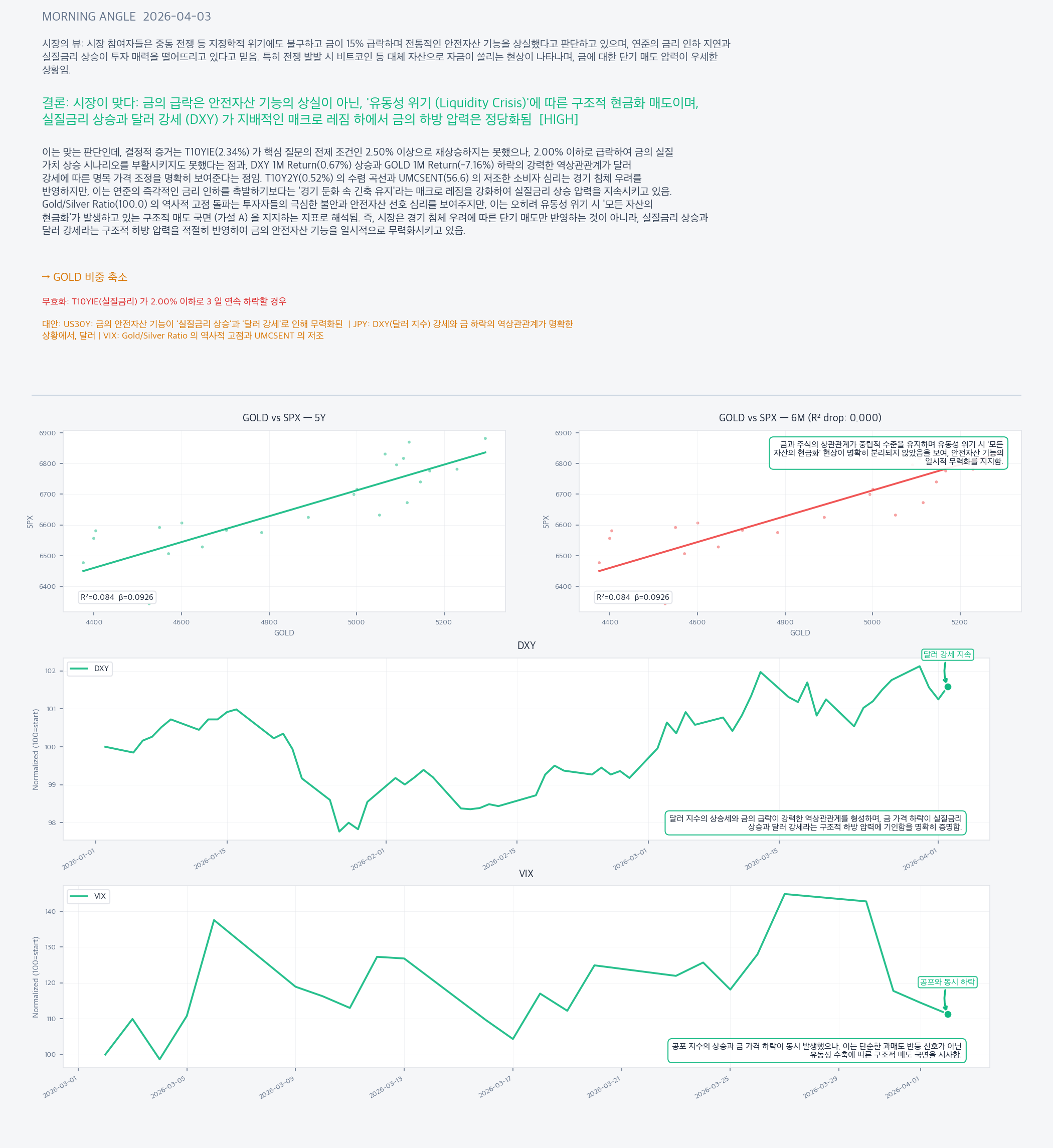 시장이 맞다: 금의 급락은 안전자산 기능의 상실이 아닌, '유동성 위기 (Liquidity Crisis)'에 따른 구조적 현금화 매도이며, 실질금리 상승과 달러 강세 (DXY) 가 지배적인 매크로 레짐 하에서 금의 하방 압력은 정당화됨