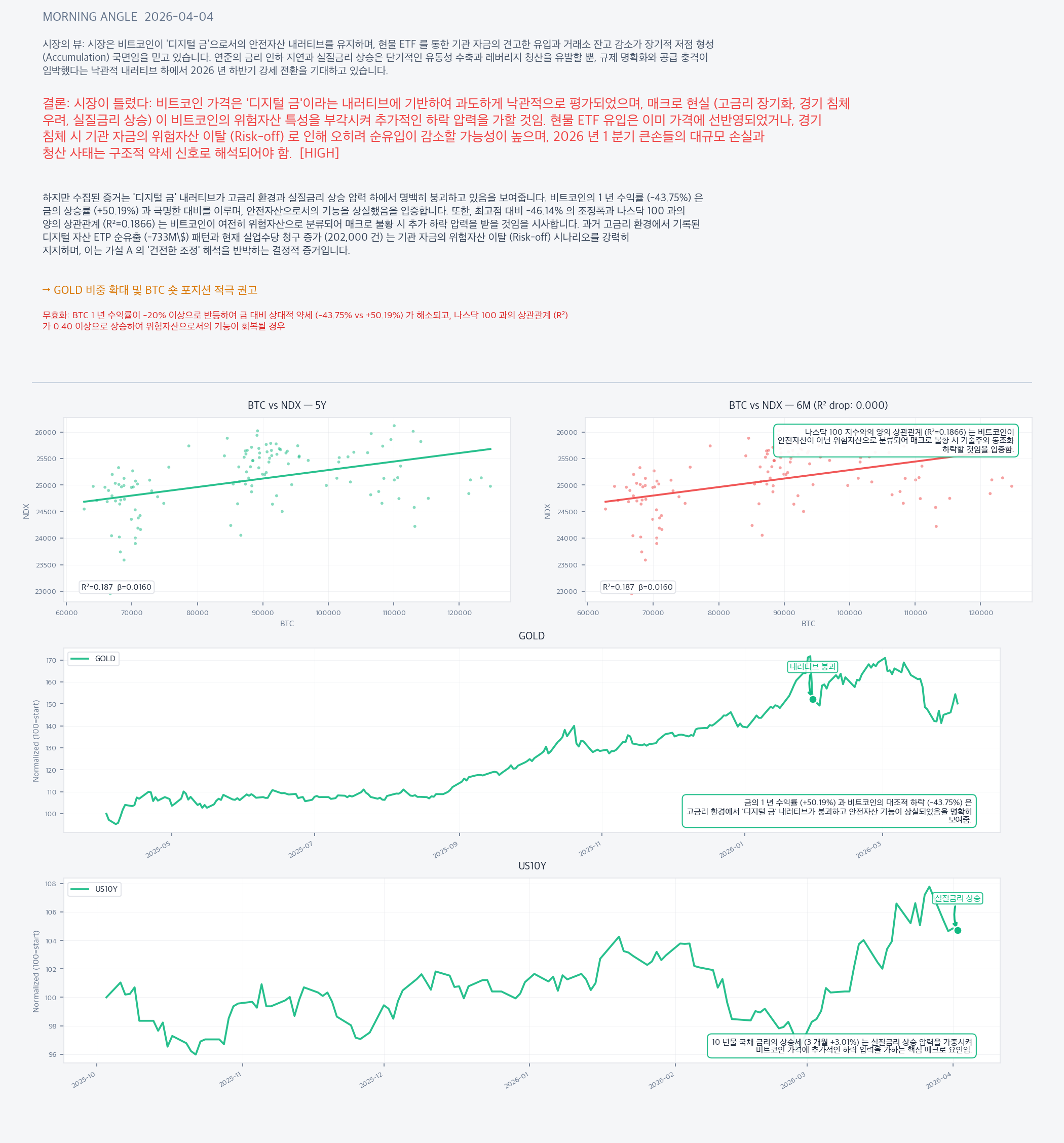 BTC 1 년 수익률이 -20% 이상으로 반등하여 금 대비 상대적 약세 (-43.75% vs +50.19%) 가 해소되고, 나스닥 100 과의 상관관계 (R²) 가 0.40 이상으로 상승하여 위험자산으로서의 기능이 회복될 경우