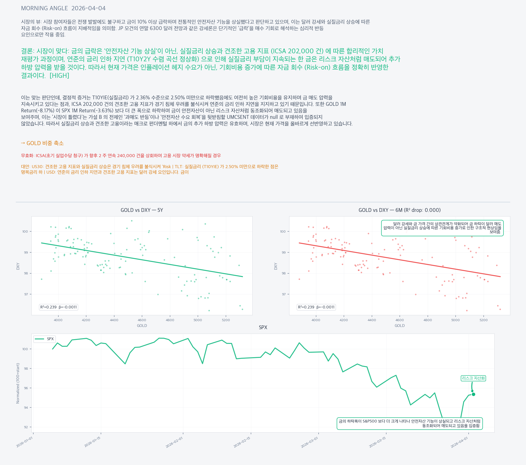 지정학적 위기 발생 시 금의 전통적 안전자산 기능 부재라는 내러티브와 실질금리 상승 및 고용 견조로 인한 리스크 온 (Risk-on) 흐름이 지배적이라는 매크로 현실 사이의 괴리임.