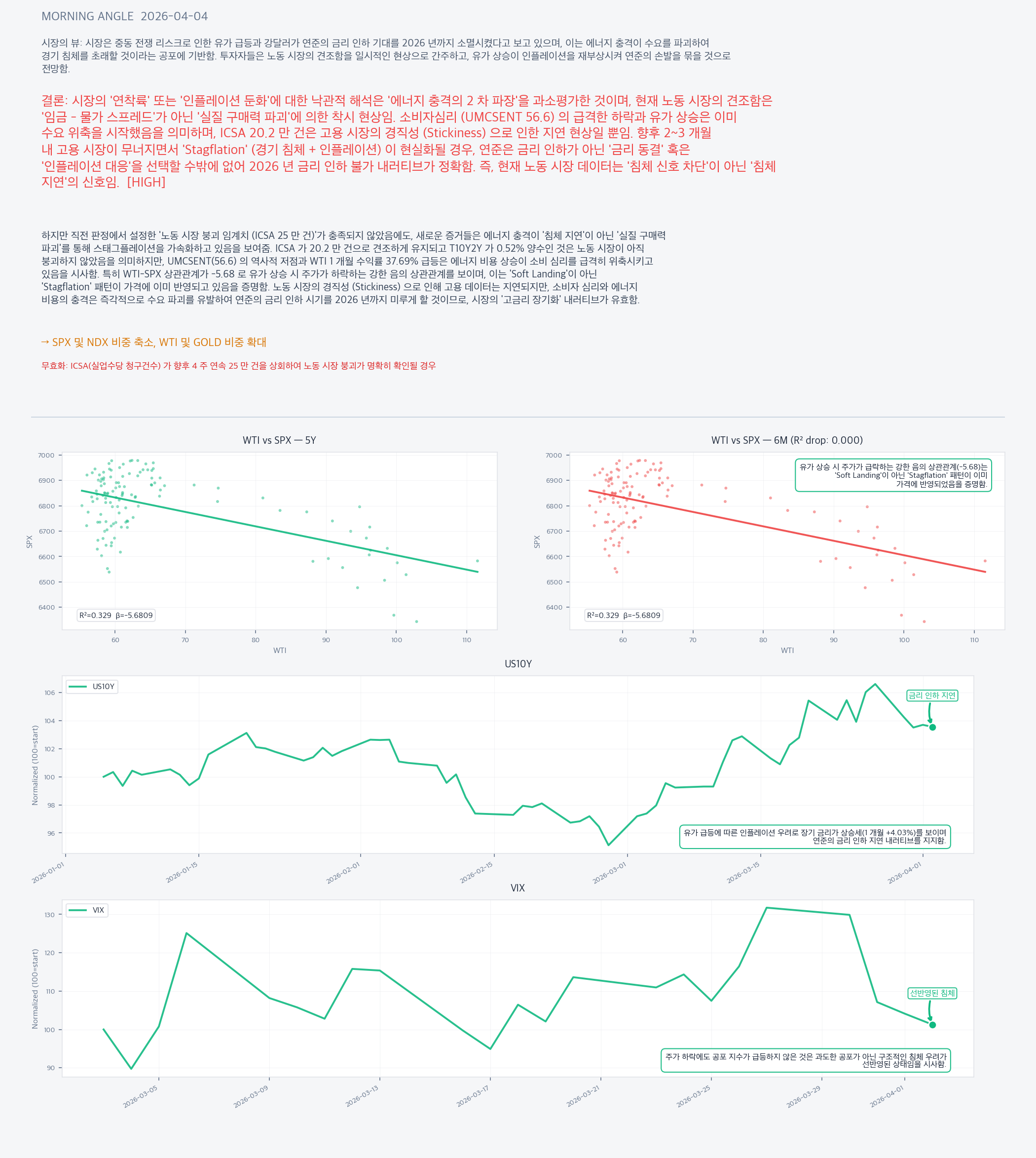 시장 내러티브는 중동 전쟁 리스크로 에너지 위기와 유가 급등이 지속될 것으로 보이나, 실제 데이터는 노동 시장 과열 (ICSA 20.2 만 건) 이 지속되면서 경기 침체 신호 (T10Y2Y 양수) 는 차단된 상태임.
