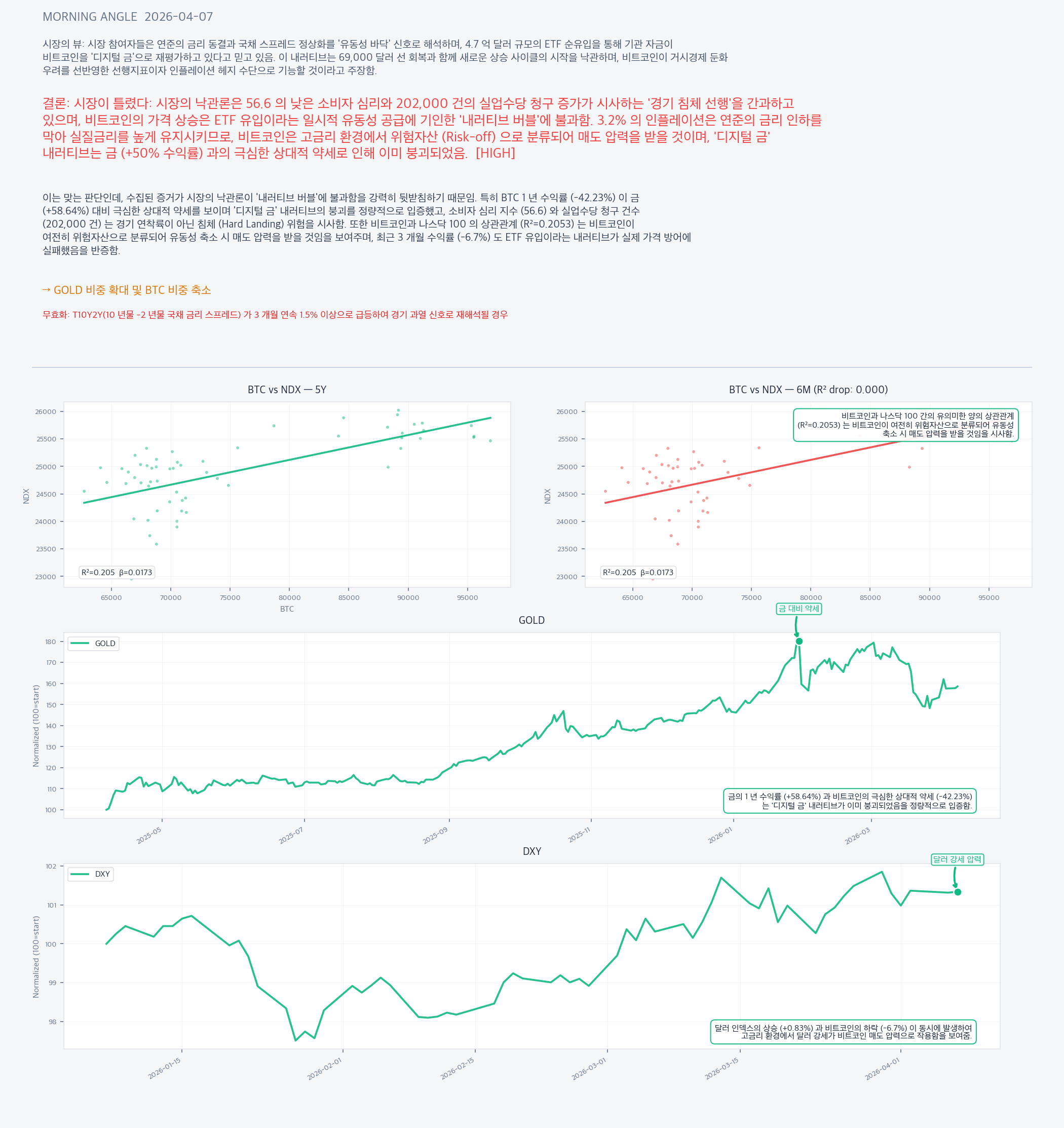 이는 맞는 판단인데, 수집된 증거가 시장의 낙관론이 '내러티브 버블'에 불과함을 강력히 뒷받침하기 때문임. 특히 BTC 1 년 수익률 (-42.23%) 이 금 (+58.64%) 대비 극심한 상대적 약세를 보이며 '디지털 금' 내러티브의 붕괴를 정량적으로 입증했고, 소비자 심리 지수 (56.6) 와 실업수당 청구 건수 (202,000 건) 는 경기 연착륙이 아닌 침체 (Hard Landing) 위험을 시사함. 또한 비트코인과 나스닥 100 의 상관관계 (R²=0.2053) 는 비트코인이 여전히 위험자산으로 분류되어 유동성 축소 시 매도 압력을 받을 것임을 보여주며, 최근 3 개월 수익률 (-6.7%) 도 ETF 유입이라는 내러티브가 실제 가격 방어에 실패했음을 반증함.