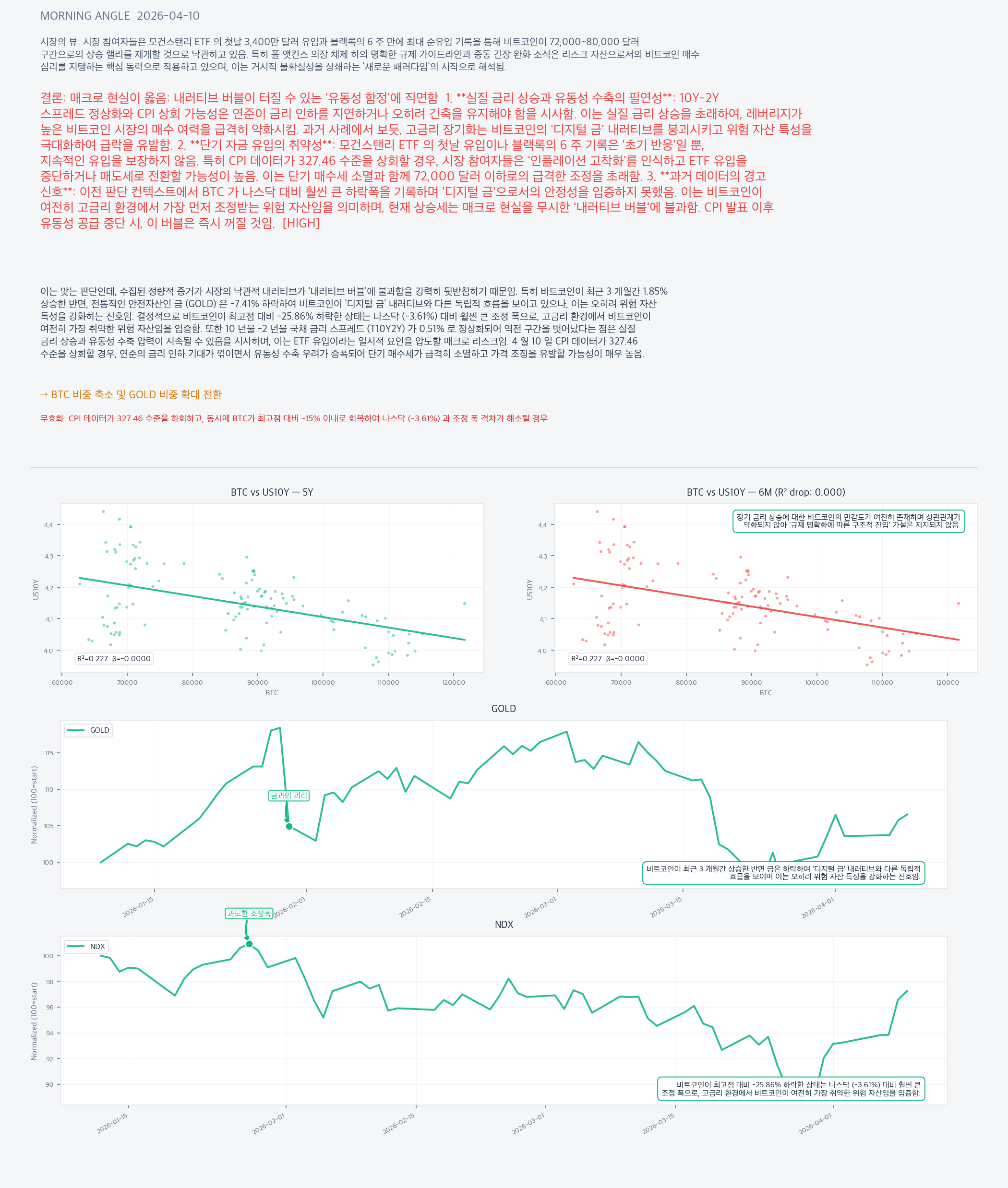 모건스탠리 ETF 유입 등 단기 자금 흐름에 기반한 가격 상승 내러티브는, 장기적인 인플레이션 고착화 데이터가 드러날 경우 단기 매수세 소멸과 함께 급격한 조정으로 이어질 수 있는 취약점을 내포함.