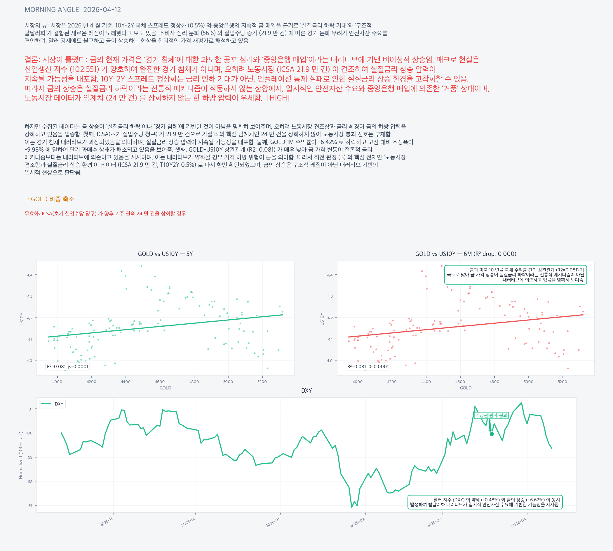 시장이 틀렸다: 금의 현재 가격은 '경기 침체'에 대한 과도한 공포 심리와 '중앙은행 매입'이라는 내러티브에 기댄 비이성적 상승임. 매크로 현실은 산업생산 지수 (102.551) 가 양호하여 완전한 경기 침체가 아니며, 오히려 노동시장 (ICSA 21.9 만 건) 이 견조하여 실질금리 상승 압력이 지속될 가능성을 내포함. 10Y-2Y 스프레드 정상화는 금리 인하 기대가 아닌, 인플레이션 통제 실패로 인한 실질금리 상승 환경을 고착화할 수 있음. 따라서 금의 상승은 실질금리 하락이라는 전통적 메커니즘이 작동하지 않는 상황에서, 일시적인 안전자산 수요와 중앙은행 매입에 의존한 '거품' 상태이며, 노동시장 데이터가 임계치 (24 만 건) 를 상회하지 않는 한 하방 압력이 우세함.