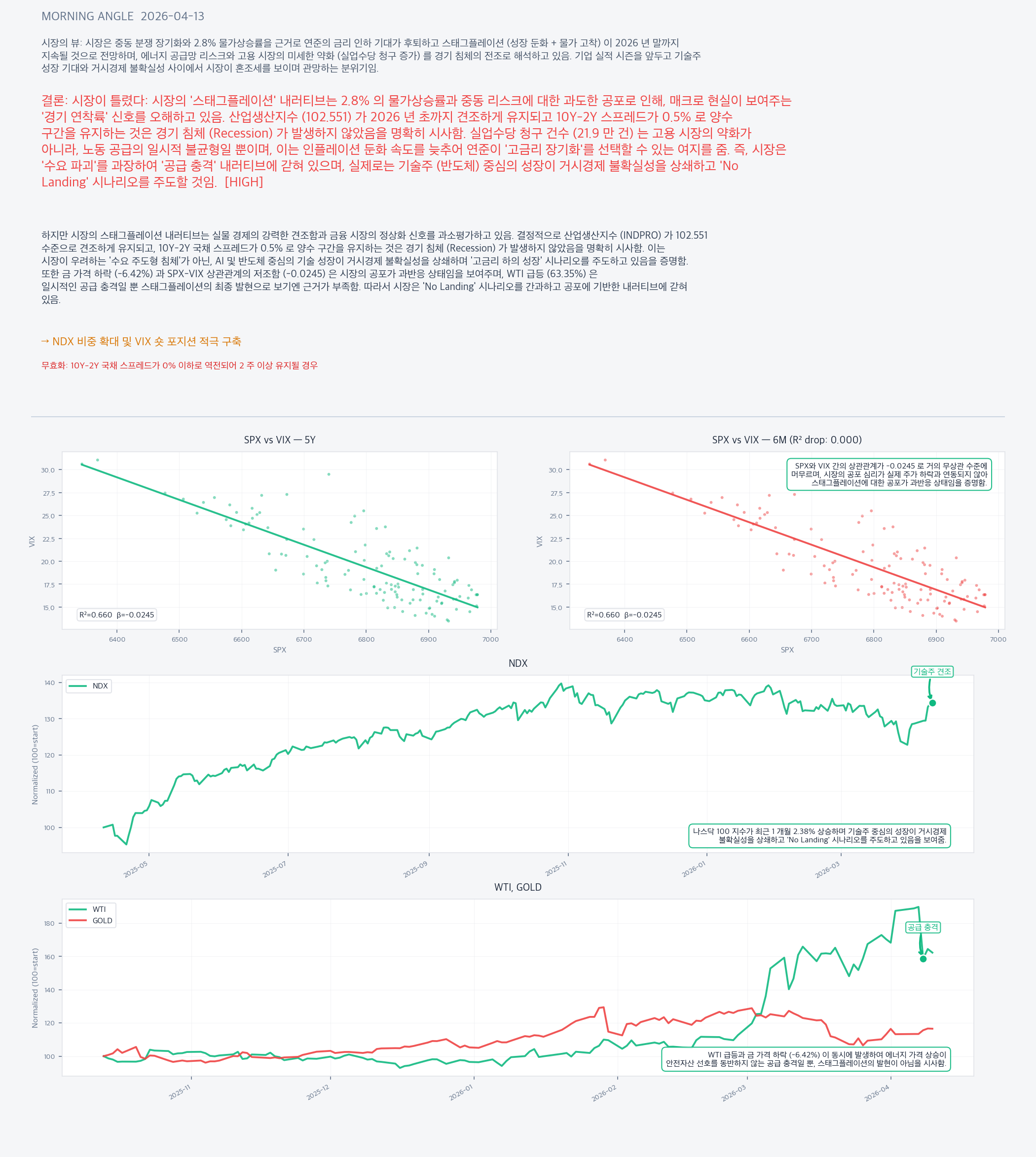 하지만 시장의 스태그플레이션 내러티브는 실물 경제의 강력한 견조함과 금융 시장의 정상화 신호를 과소평가하고 있음. 결정적으로 산업생산지수 (INDPRO) 가 102.551 수준으로 견조하게 유지되고, 10Y-2Y 국채 스프레드가 0.5% 로 양수 구간을 유지하는 것은 경기 침체 (Recession) 가 발생하지 않았음을 명확히 시사함. 이는 시장이 우려하는 '수요 주도형 침체'가 아닌, AI 및 반도체 중심의 기술 성장이 거시경제 불확실성을 상쇄하며 '고금리 하의 성장' 시나리오를 주도하고 있음을 증명함. 또한 금 가격 하락 (-6.42%) 과 SPX-VIX 상관관계의 저조함 (-0.0245) 은 시장의 공포가 과반응 상태임을 보여주며, WTI 급등 (63.35%) 은 일시적인 공급 충격일 뿐 스태그플레이션의 최종 발현으로 보기엔 근거가 부족함. 따라서 시장은 'No Landing' 시나리오를 간과하고 공포에 기반한 내러티브에 갇혀 있음.