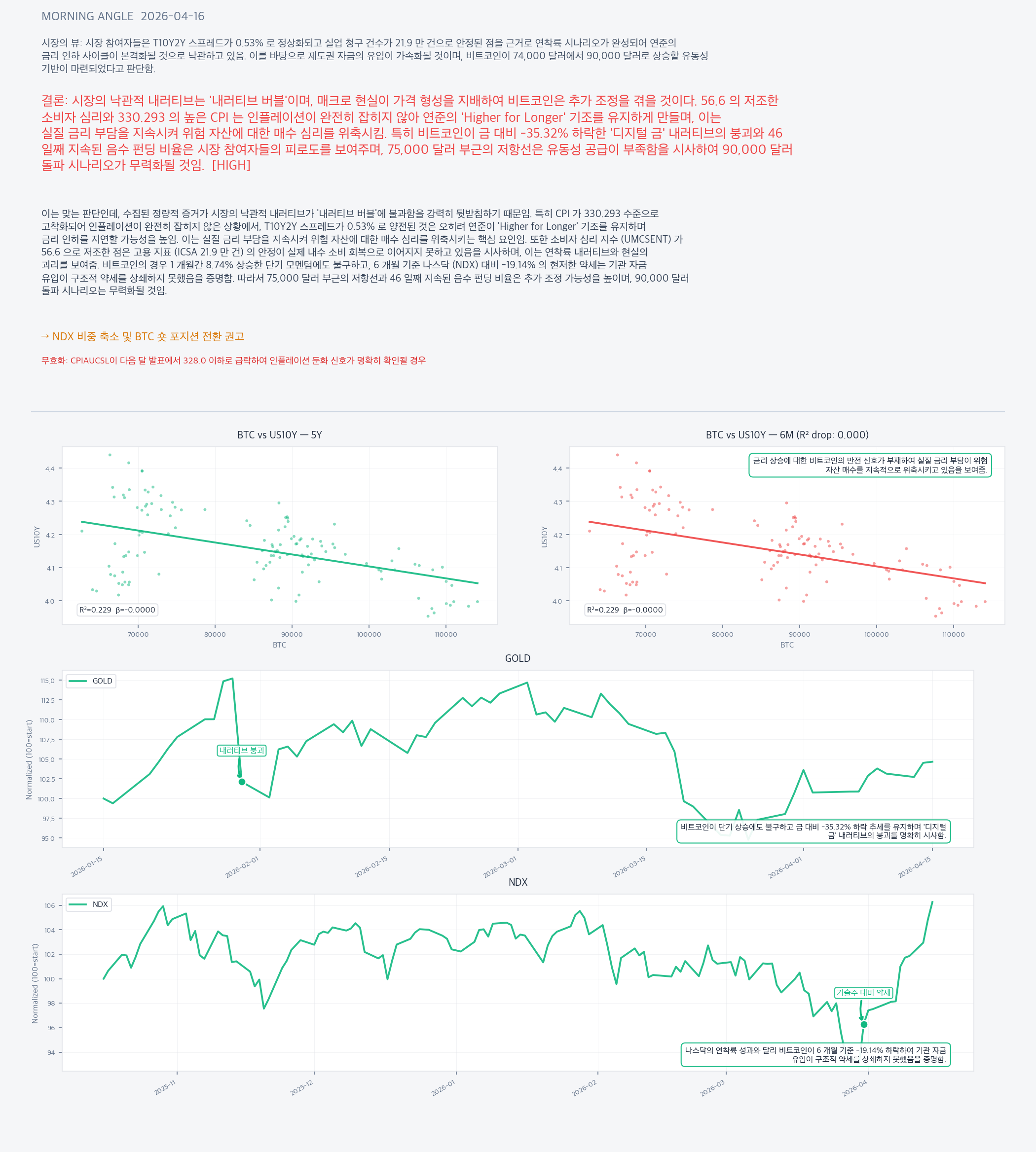 이는 맞는 판단인데, 수집된 정량적 증거가 시장의 낙관적 내러티브가 '내러티브 버블'에 불과함을 강력히 뒷받침하기 때문임. 특히 CPI 가 330.293 수준으로 고착화되어 인플레이션이 완전히 잡히지 않은 상황에서, T10Y2Y 스프레드가 0.53% 로 양전된 것은 오히려 연준이 'Higher for Longer' 기조를 유지하며 금리 인하를 지연할 가능성을 높임. 이는 실질 금리 부담을 지속시켜 위험 자산에 대한 매수 심리를 위축시키는 핵심 요인임. 또한 소비자 심리 지수 (UMCSENT) 가 56.6 으로 저조한 점은 고용 지표 (ICSA 21.9 만 건) 의 안정이 실제 내수 소비 회복으로 이어지지 못하고 있음을 시사하며, 이는 연착륙 내러티브와 현실의 괴리를 보여줌. 비트코인의 경우 1 개월간 8.74% 상승한 단기 모멘텀에도 불구하고, 6 개월 기준 나스닥 (NDX) 대비 -19.14% 의 현저한 약세는 기관 자금 유입이 구조적 약세를 상쇄하지 못했음을 증명함. 따라서 75,000 달러 부근의 저항선과 46 일째 지속된 음수 펀딩 비율은 추가 조정 가능성을 높이며, 90,000 달러 돌파 시나리오는 무력화될 것임.