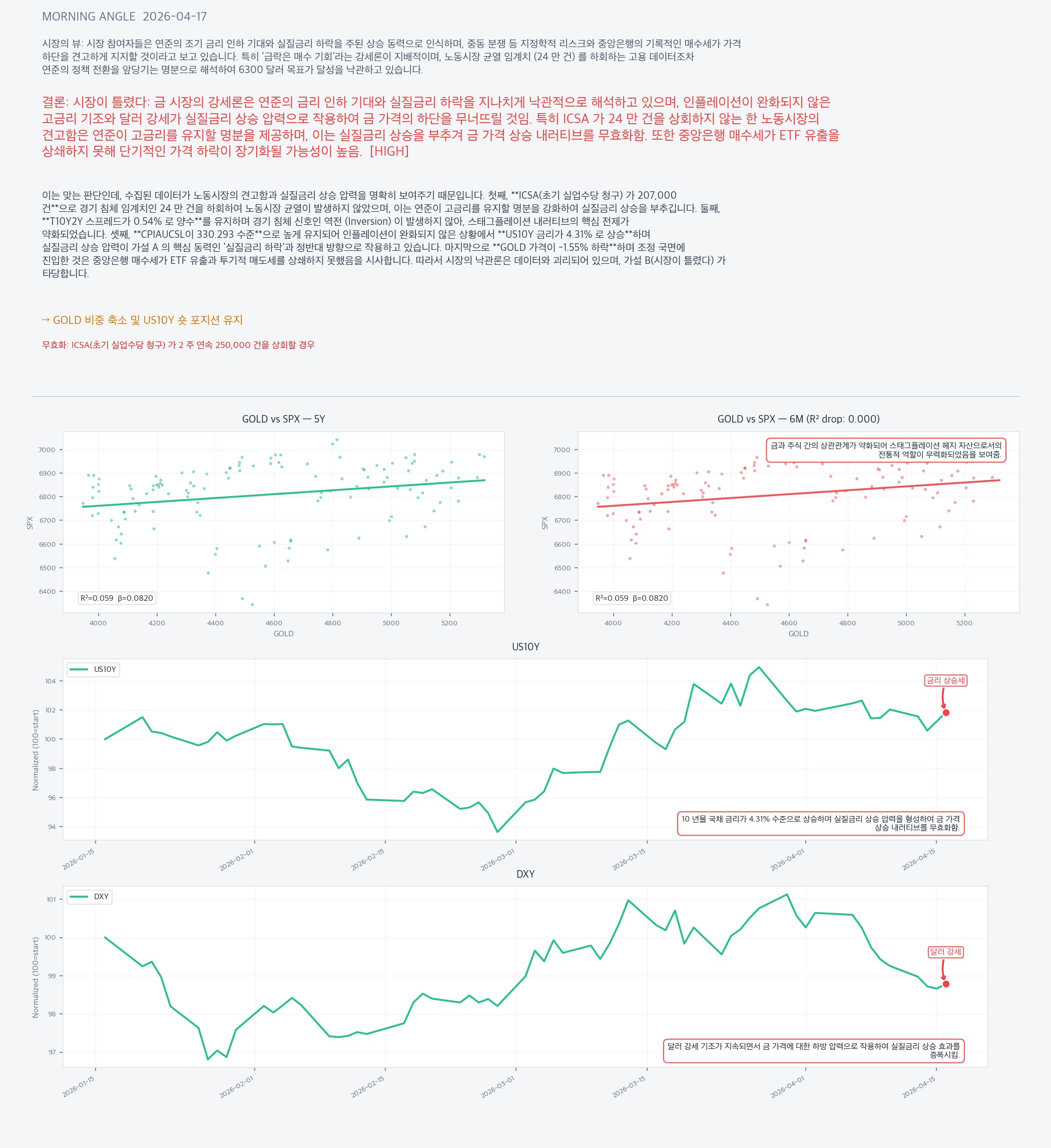 이는 맞는 판단인데, 수집된 데이터가 노동시장의 견고함과 실질금리 상승 압력을 명확히 보여주기 때문입니다. 첫째, **ICSA(초기 실업수당 청구) 가 207,000 건**으로 경기 침체 임계치인 24 만 건을 하회하여 노동시장 균열이 발생하지 않았으며, 이는 연준이 고금리를 유지할 명분을 강화하여 실질금리 상승을 부추깁니다. 둘째, **T10Y2Y 스프레드가 0.54% 로 양수**를 유지하며 경기 침체 신호인 역전 (Inversion) 이 발생하지 않아, 스태그플레이션 내러티브의 핵심 전제가 약화되었습니다. 셋째, **CPIAUCSL이 330.293 수준**으로 높게 유지되어 인플레이션이 완화되지 않은 상황에서 **US10Y 금리가 4.31% 로 상승**하며 실질금리 상승 압력이 가설 A 의 핵심 동력인 '실질금리 하락'과 정반대 방향으로 작용하고 있습니다. 마지막으로 **GOLD 가격이 -1.55% 하락**하며 조정 국면에 진입한 것은 중앙은행 매수세가 ETF 유출과 투기적 매도세를 상쇄하지 못했음을 시사합니다. 따라서 시장의 낙관론은 데이터와 괴리되어 있으며, 가설 B(시장이 틀렸다) 가 타당합니다.