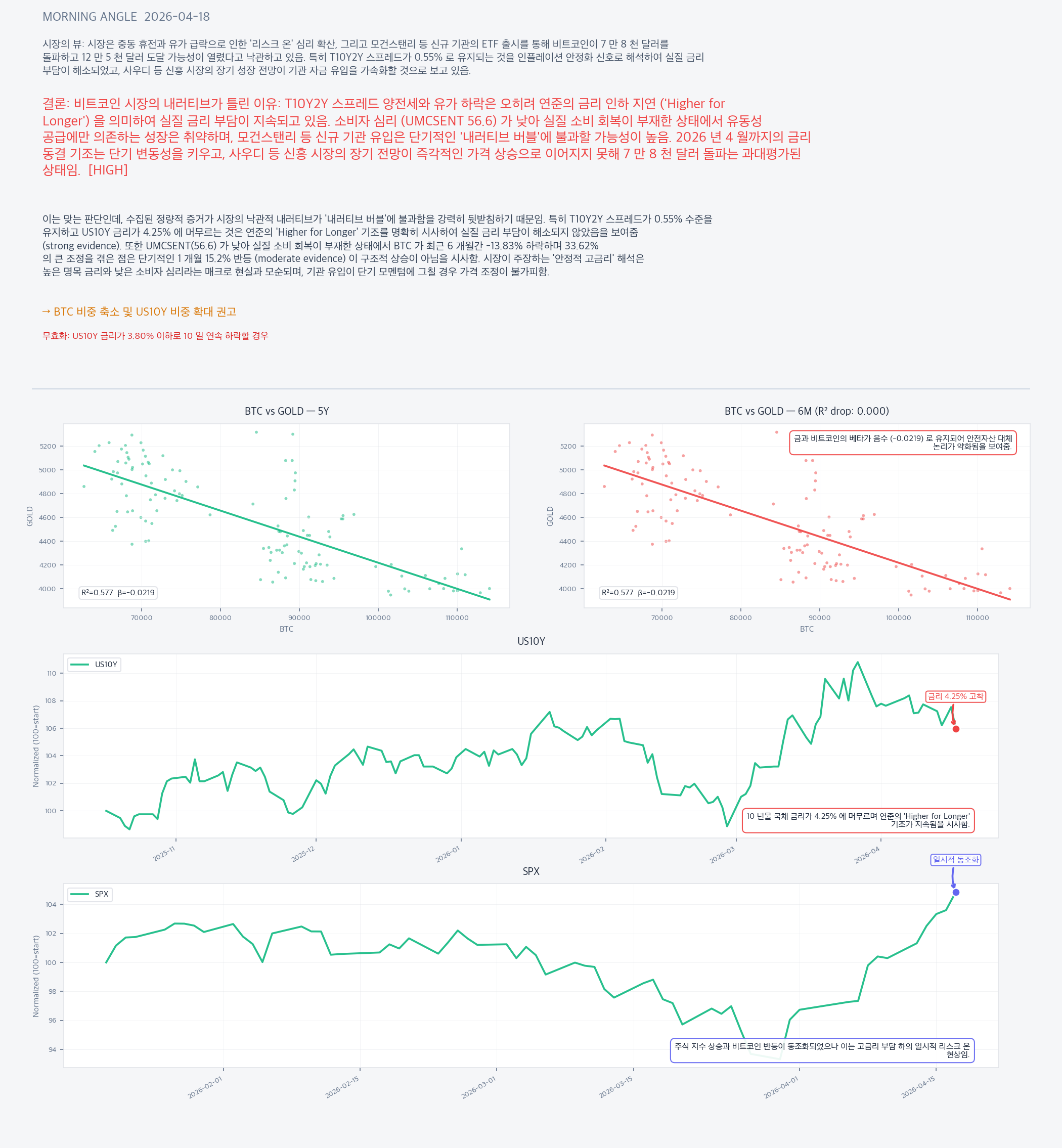 시장 내러티브는 유가 하락과 중동 휴전으로 리스크 온 심리가 완전히 정립되어 BTC가 12만 5천 달러로 직진할 것으로 보이나, 매크로 현실은 소비자 심리 (UMCSENT) 가 여전히 낮아 실질 소비 회복 없이 유동성 공급에만 의존하는 취약한 성장 국면임을 시사함.