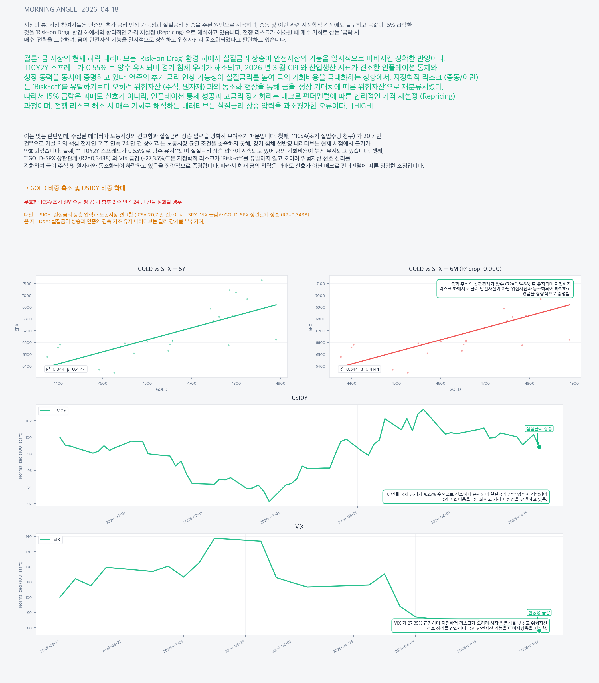 VIX 급감과 GOLD-SPX 상관관계 상승 (R2=0.3438) 은 지정학적 리스크가 안전자산 선호가 아닌 위험자산 선호 (Risk-on) 로 작용하고 있음을 시사하므로, 금 하락 시 주식 시장으로 자금 이동이 예상됩니다.