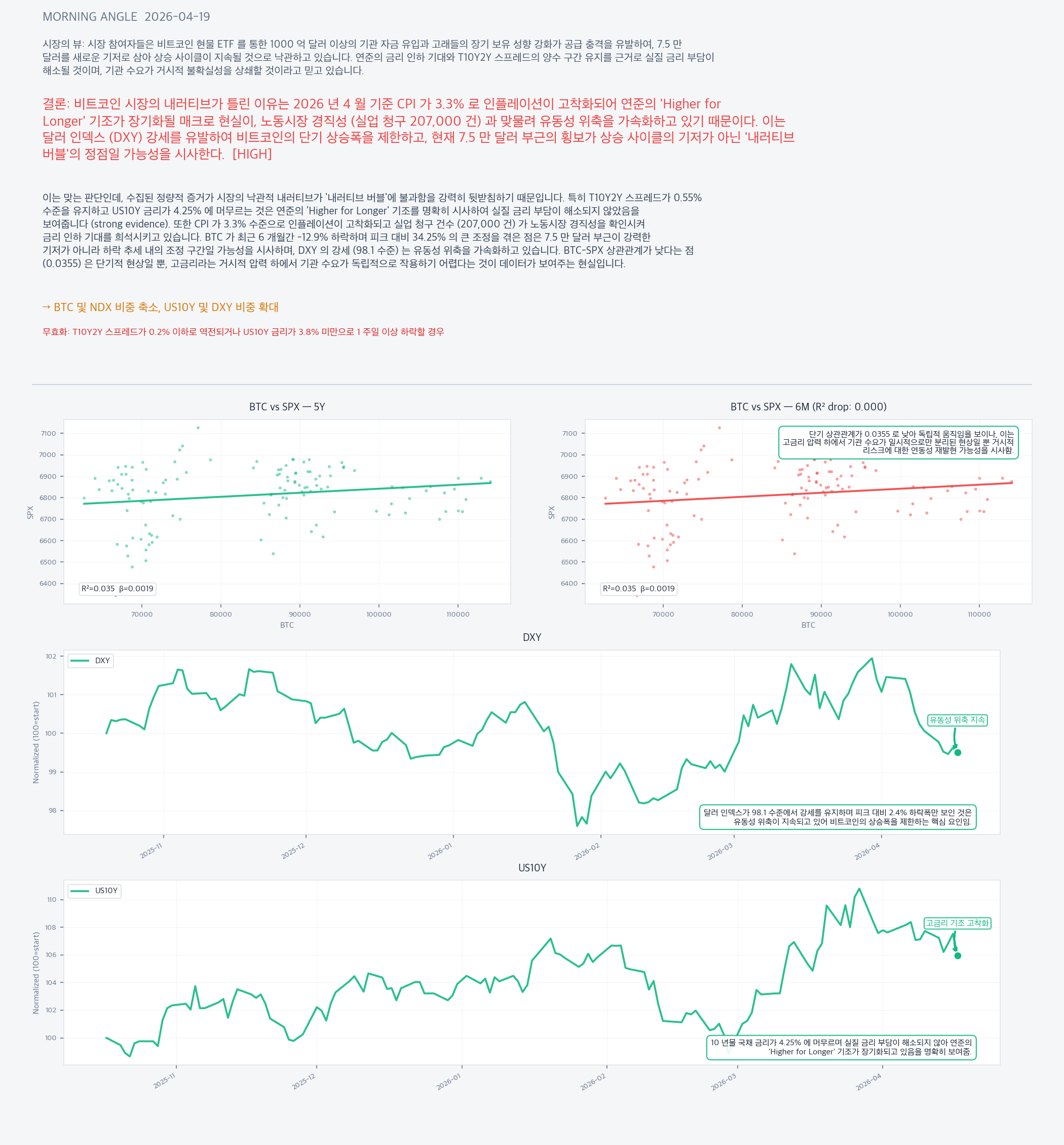 비트코인 시장의 내러티브가 틀린 이유는 2026 년 4 월 기준 CPI 가 3.3% 로 인플레이션이 고착화되어 연준의 'Higher for Longer' 기조가 장기화될 매크로 현실이, 노동시장 경직성 (실업 청구 207,000 건) 과 맞물려 유동성 위축을 가속화하고 있기 때문이다. 이는 달러 인덱스 (DXY) 강세를 유발하여 비트코인의 단기 상승폭을 제한하고, 현재 7.5 만 달러 부근의 횡보가 상승 사이클의 기저가 아닌 '내러티브 버블'의 정점일 가능성을 시사한다.