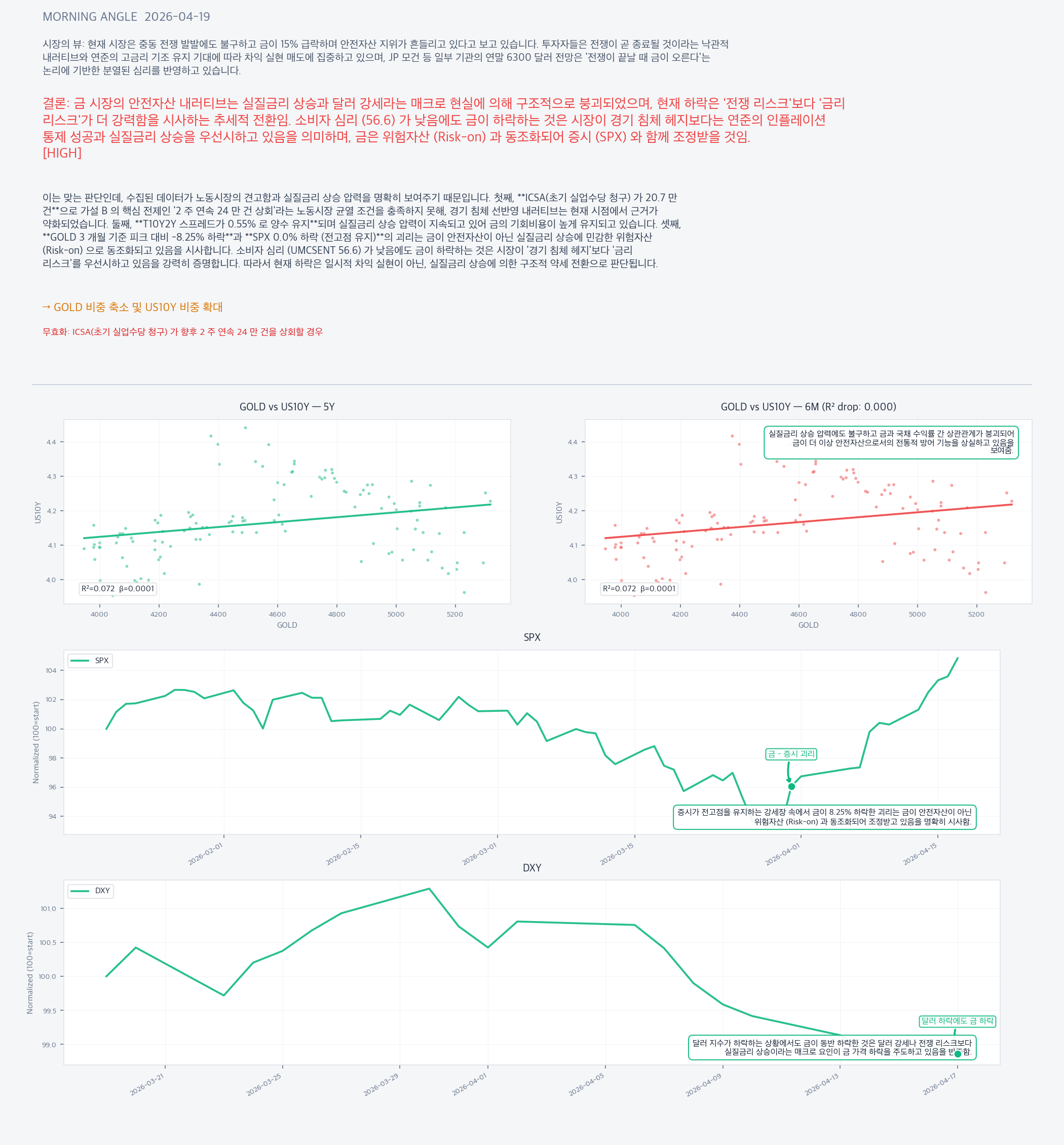 금 시장의 안전자산 내러티브는 실질금리 상승과 달러 강세라는 매크로 현실에 의해 구조적으로 붕괴되었으며, 현재 하락은 '전쟁 리스크'보다 '금리 리스크'가 더 강력함을 시사하는 추세적 전환임. 소비자 심리 (56.6) 가 낮음에도 금이 하락하는 것은 시장이 경기 침체 헤지보다는 연준의 인플레이션 통제 성공과 실질금리 상승을 우선시하고 있음을 의미하며, 금은 위험자산 (Risk-on) 과 동조화되어 증시 (SPX) 와 함께 조정받을 것임.
