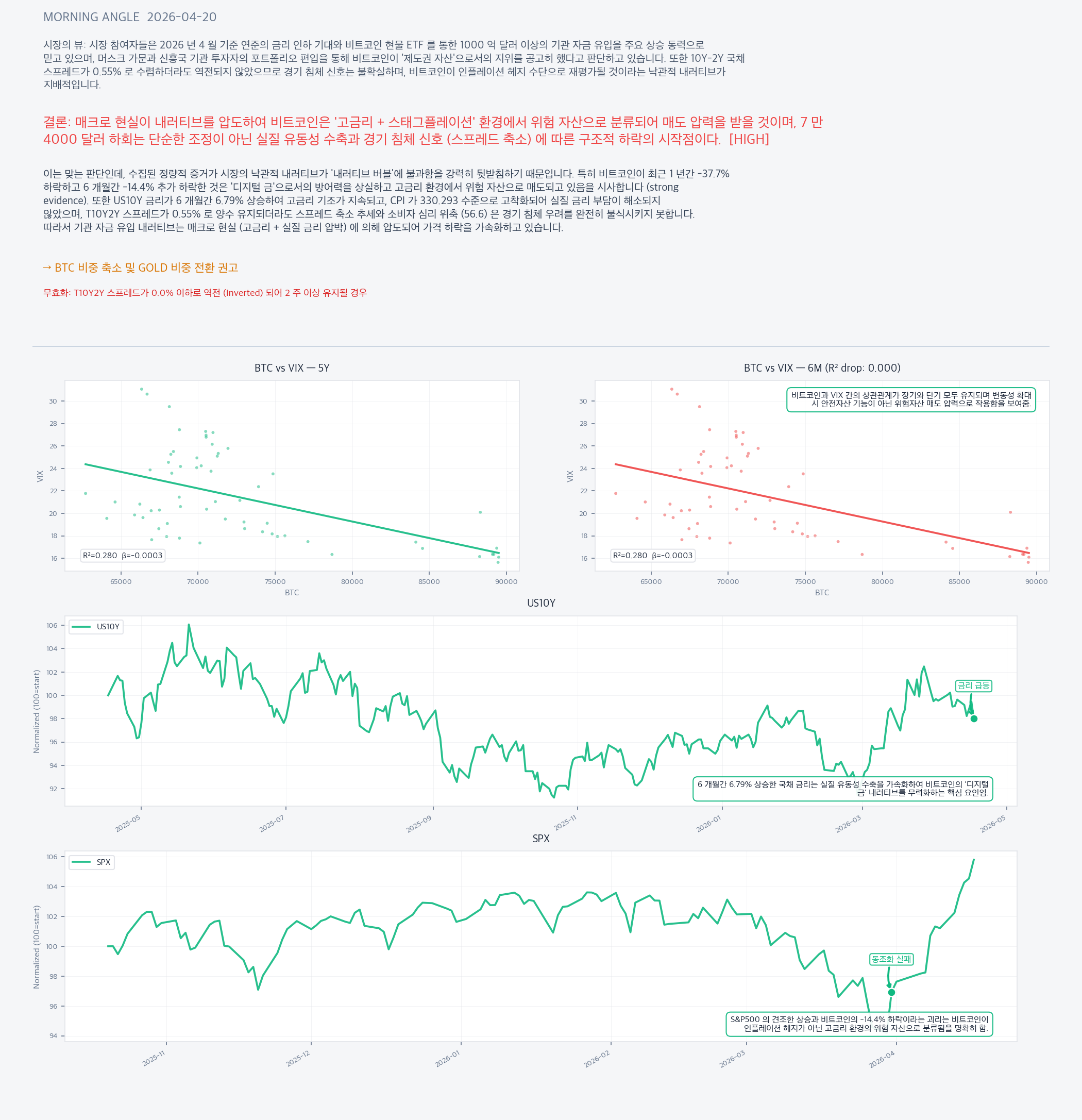 이는 맞는 판단인데, 수집된 정량적 증거가 시장의 낙관적 내러티브가 '내러티브 버블'에 불과함을 강력히 뒷받침하기 때문입니다. 특히 비트코인이 최근 1 년간 -37.7% 하락하고 6 개월간 -14.4% 추가 하락한 것은 '디지털 금'으로서의 방어력을 상실하고 고금리 환경에서 위험 자산으로 매도되고 있음을 시사합니다 (strong evidence). 또한 US10Y 금리가 6 개월간 6.79% 상승하여 고금리 기조가 지속되고, CPI 가 330.293 수준으로 고착화되어 실질 금리 부담이 해소되지 않았으며, T10Y2Y 스프레드가 0.55% 로 양수 유지되더라도 스프레드 축소 추세와 소비자 심리 위축 (56.6) 은 경기 침체 우려를 완전히 불식시키지 못합니다. 따라서 기관 자금 유입 내러티브는 매크로 현실 (고금리 + 실질 금리 압박) 에 의해 압도되어 가격 하락을 가속화하고 있습니다.