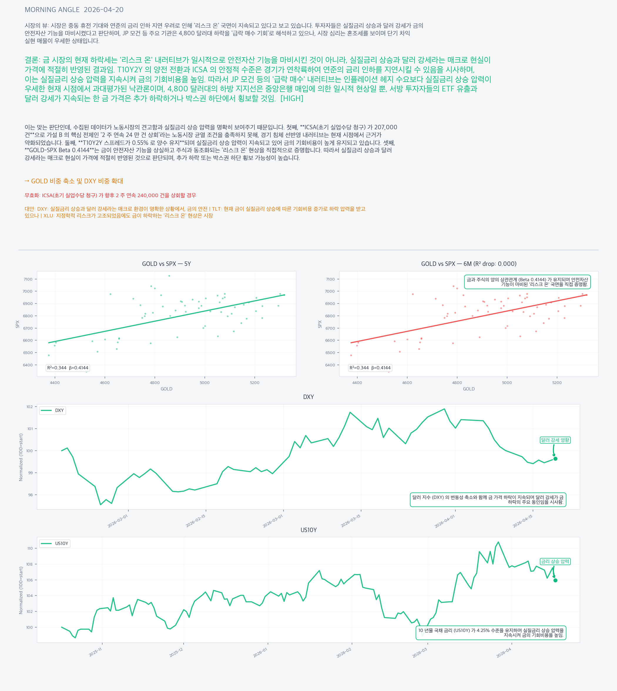 금 시장의 현재 하락세는 '리스크 온' 내러티브가 일시적으로 안전자산 기능을 마비시킨 것이 아니라, 실질금리 상승과 달러 강세라는 매크로 현실이 가격에 적절히 반영된 결과임. T10Y2Y 의 양전 전환과 ICSA 의 안정적 수준은 경기가 연착륙하여 연준의 금리 인하를 지연시킬 수 있음을 시사하며, 이는 실질금리 상승 압력을 지속시켜 금의 기회비용을 높임. 따라서 JP 모건 등의 '급락 매수' 내러티브는 인플레이션 헤지 수요보다 실질금리 상승 압력이 우세한 현재 시점에서 과대평가된 낙관론이며, 4,800 달러대의 하방 지지선은 중앙은행 매입에 의한 일시적 현상일 뿐, 서방 투자자들의 ETF 유출과 달러 강세가 지속되는 한 금 가격은 추가 하락하거나 박스권 하단에서 횡보할 것임.