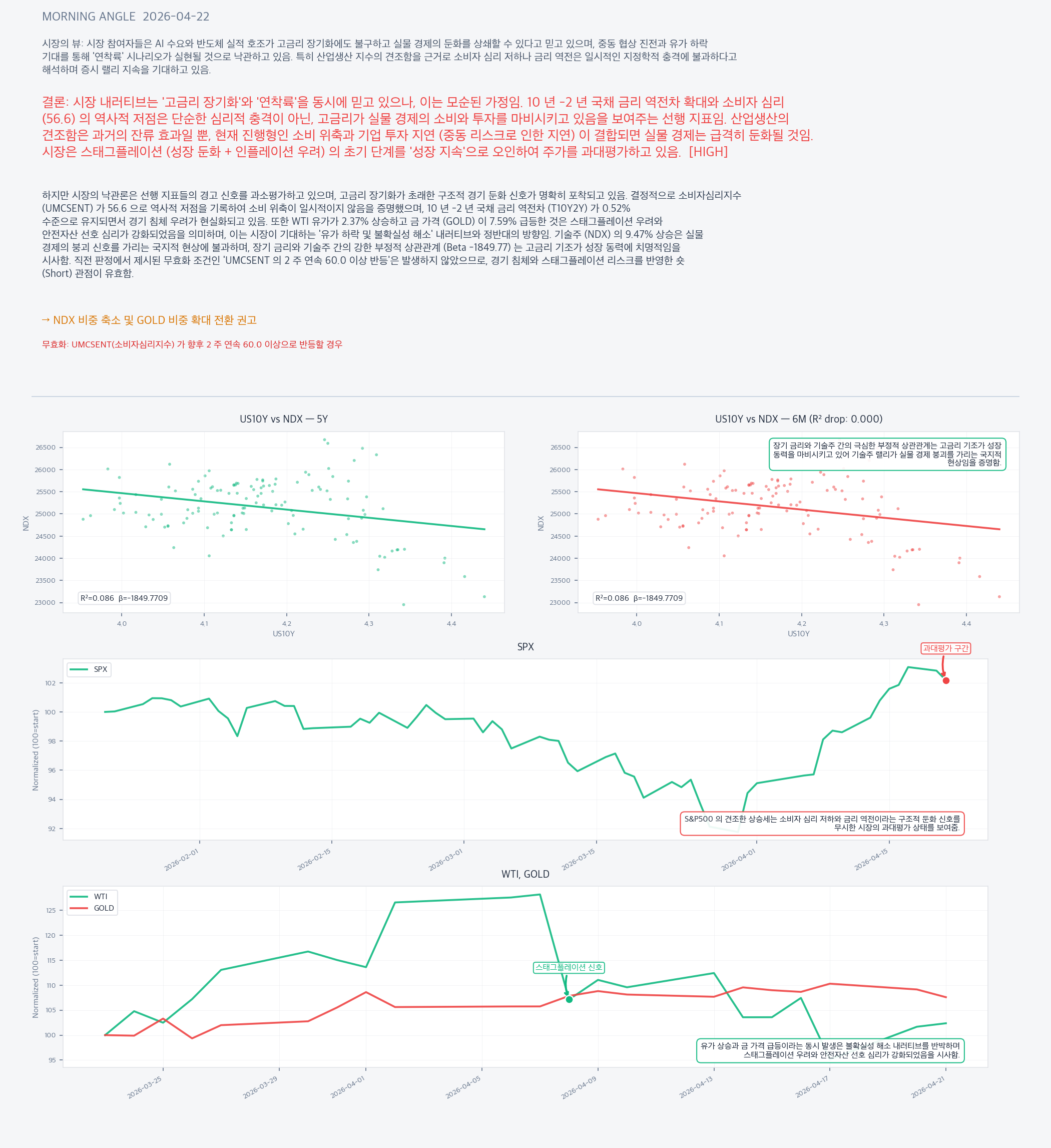 하지만 시장의 낙관론은 선행 지표들의 경고 신호를 과소평가하고 있으며, 고금리 장기화가 초래한 구조적 경기 둔화 신호가 명확히 포착되고 있음. 결정적으로 소비자심리지수 (UMCSENT) 가 56.6 으로 역사적 저점을 기록하여 소비 위축이 일시적이지 않음을 증명했으며, 10 년 -2 년 국채 금리 역전차 (T10Y2Y) 가 0.52% 수준으로 유지되면서 경기 침체 우려가 현실화되고 있음. 또한 WTI 유가가 2.37% 상승하고 금 가격 (GOLD) 이 7.59% 급등한 것은 스태그플레이션 우려와 안전자산 선호 심리가 강화되었음을 의미하며, 이는 시장이 기대하는 '유가 하락 및 불확실성 해소' 내러티브와 정반대의 방향임. 기술주 (NDX) 의 9.47% 상승은 실물 경제의 붕괴 신호를 가리는 국지적 현상에 불과하며, 장기 금리와 기술주 간의 강한 부정적 상관관계 (Beta -1849.77) 는 고금리 기조가 성장 동력에 치명적임을 시사함. 직전 판정에서 제시된 무효화 조건인 'UMCSENT 의 2 주 연속 60.0 이상 반등'은 발생하지 않았으므로, 경기 침체와 스태그플레이션 리스크를 반영한 숏 (Short) 관점이 유효함.