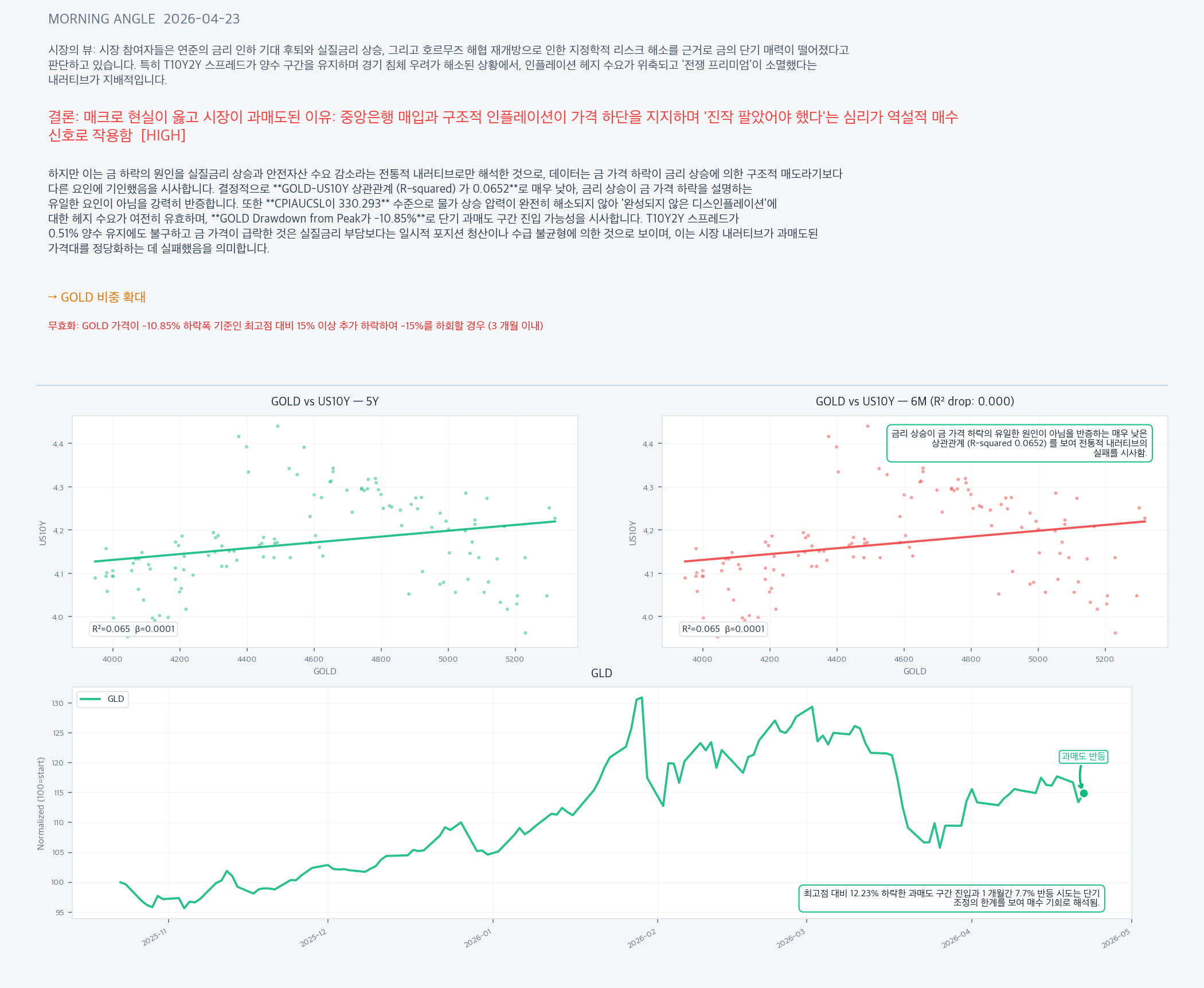 하지만 이는 금 하락의 원인을 실질금리 상승과 안전자산 수요 감소라는 전통적 내러티브로만 해석한 것으로, 데이터는 금 가격 하락이 금리 상승에 의한 구조적 매도라기보다 다른 요인에 기인했음을 시사합니다. 결정적으로 **GOLD-US10Y 상관관계 (R-squared) 가 0.0652**로 매우 낮아, 금리 상승이 금 가격 하락을 설명하는 유일한 요인이 아님을 강력히 반증합니다. 또한 **CPIAUCSL이 330.293** 수준으로 물가 상승 압력이 완전히 해소되지 않아 '완성되지 않은 디스인플레이션'에 대한 헤지 수요가 여전히 유효하며, **GOLD Drawdown from Peak가 -10.85%**로 단기 과매도 구간 진입 가능성을 시사합니다. T10Y2Y 스프레드가 0.51% 양수 유지에도 불구하고 금 가격이 급락한 것은 실질금리 부담보다는 일시적 포지션 청산이나 수급 불균형에 의한 것으로 보이며, 이는 시장 내러티브가 과매도된 가격대를 정당화하는 데 실패했음을 의미합니다.