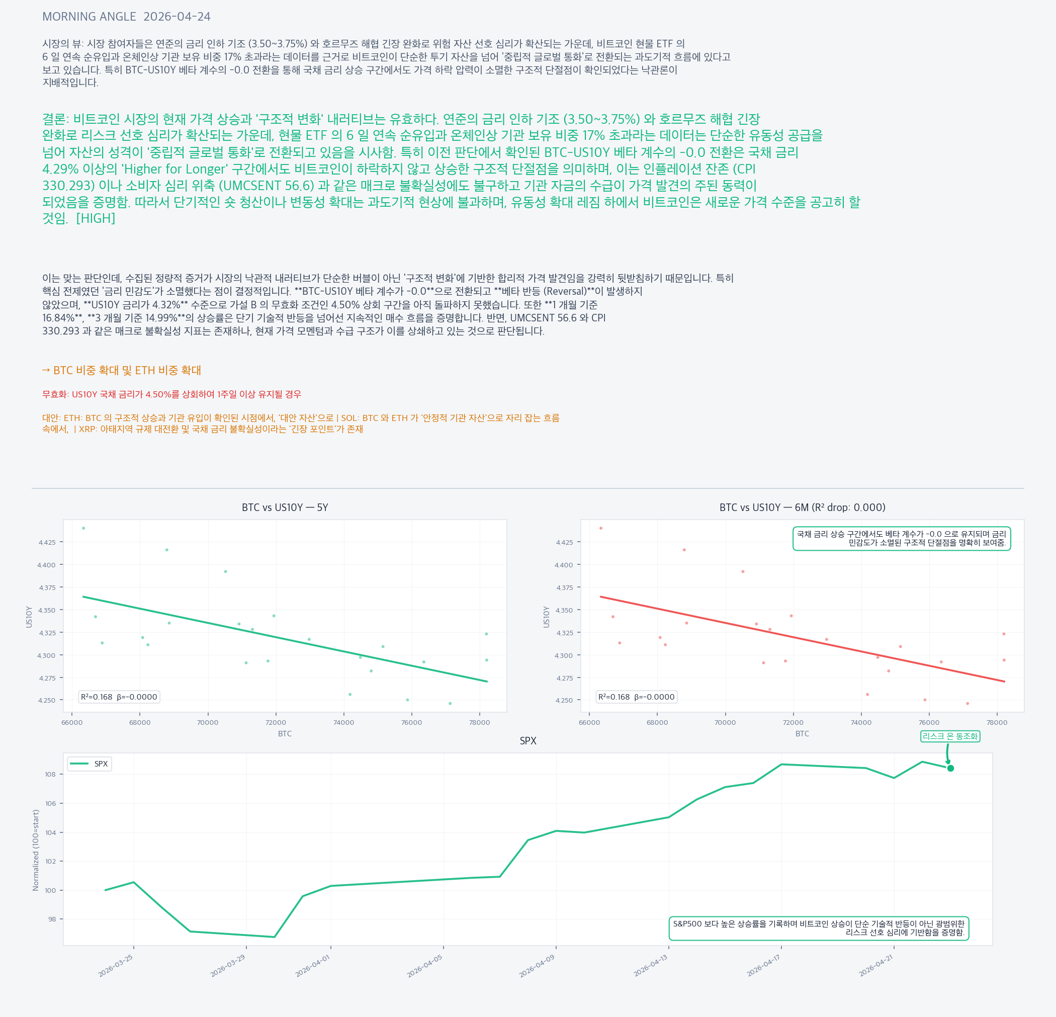 비트코인 시장의 현재 가격 상승과 '구조적 변화' 내러티브는 유효하다. 연준의 금리 인하 기조 (3.50~3.75%) 와 호르무즈 해협 긴장 완화로 리스크 선호 심리가 확산되는 가운데, 현물 ETF 의 6 일 연속 순유입과 온체인상 기관 보유 비중 17% 초과라는 데이터는 단순한 유동성 공급을 넘어 자산의 성격이 '중립적 글로벌 통화'로 전환되고 있음을 시사함. 특히 이전 판단에서 확인된 BTC-US10Y 베타 계수의 -0.0 전환은 국채 금리 4.29% 이상의 'Higher for Longer' 구간에서도 비트코인이 하락하지 않고 상승한 구조적 단절점을 의미하며, 이는 인플레이션 잔존 (CPI 330.293) 이나 소비자 심리 위축 (UMCSENT 56.6) 과 같은 매크로 불확실성에도 불구하고 기관 자금의 수급이 가격 발견의 주된 동력이 되었음을 증명함. 따라서 단기적인 숏 청산이나 변동성 확대는 과도기적 현상에 불과하며, 유동성 확대 레짐 하에서 비트코인은 새로운 가격 수준을 공고히 할 것임.