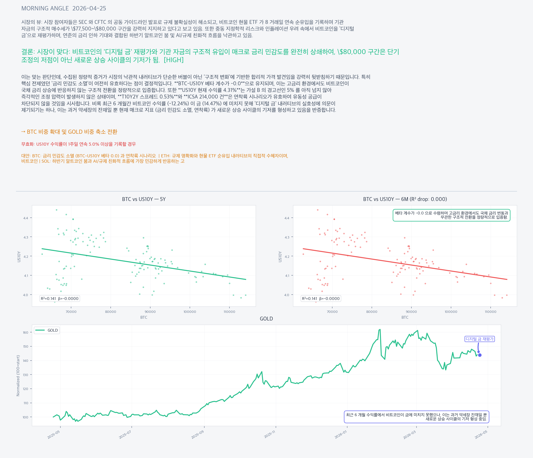 금리 민감도 소멸 (BTC-US10Y 베타 0.0) 과 연착륙 시나리오 하에서 '디지털 금'으로서의 구조적 가치 재평가가 본격화될 핵심 자산입니다.