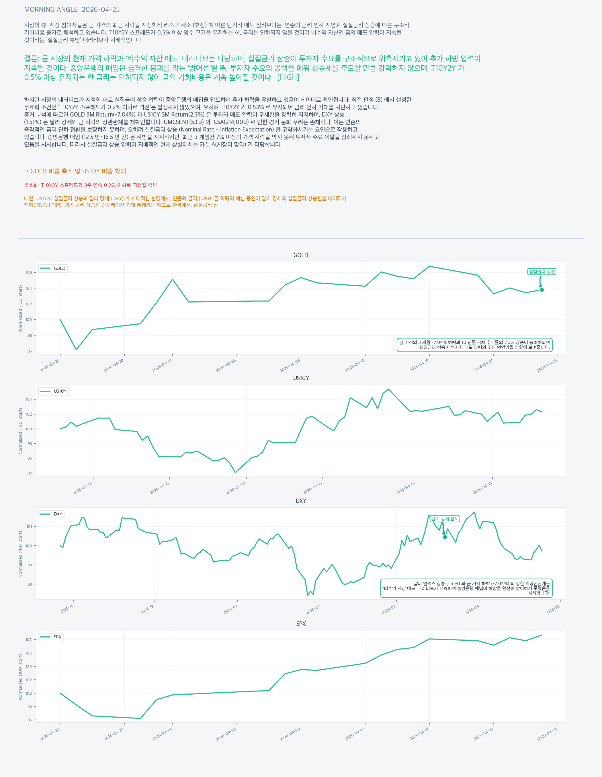 2026 년 4 월 기준 실질금리 상승이 금 가격에 직접적인 하방 압력으로 작용하고 있으며, 중앙은행의 지속적인 매입이 투자자 수요 이탈을 방어하며 하방 경직성을 유지하고 있음.