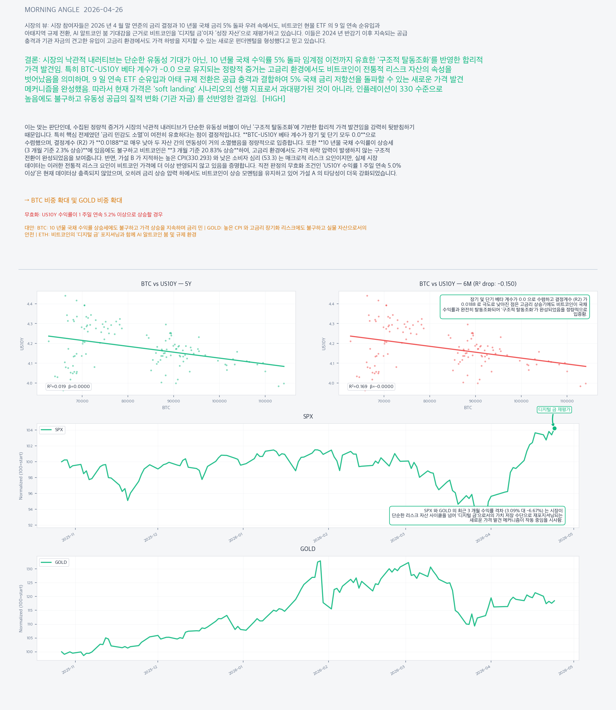 시장의 낙관적 내러티브는 단순한 유동성 기대가 아닌, 10 년물 국채 수익률 5% 돌파 임계점 이전까지 유효한 '구조적 탈동조화'를 반영한 합리적 가격 발견임. 특히 BTC-US10Y 베타 계수가 -0.0 으로 유지되는 정량적 증거는 고금리 환경에서도 비트코인이 전통적 리스크 자산의 속성을 벗어났음을 의미하며, 9 일 연속 ETF 순유입과 아태 규제 전환은 공급 충격과 결합하여 5% 국채 금리 저항선을 돌파할 수 있는 새로운 가격 발견 메커니즘을 완성했음. 따라서 현재 가격은 'soft landing' 시나리오의 선행 지표로서 과대평가된 것이 아니라, 인플레이션이 330 수준으로 높음에도 불구하고 유동성 공급의 질적 변화 (기관 자금) 를 선반영한 결과임.