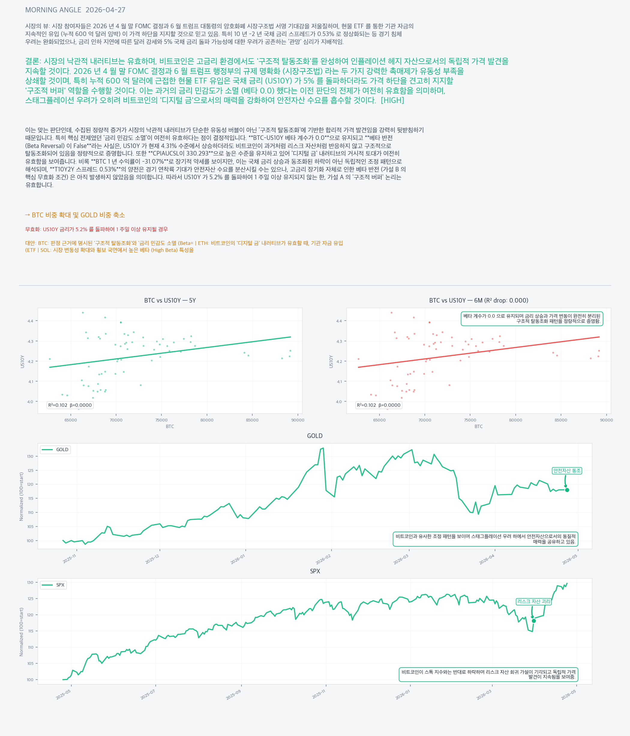 비트코인 시장의 현재 가격과 내러티브는 옳다. 이는 단순한 유동성 기대가 아닌, 금리 민감도가 구조적으로 소멸한 (BTC-US10Y 베타 0.0) 새로운 자산 클래스로서의 '탈동조화'가 완성된 결과이며, ETF 를 통한 제도권 자금 유입과 공급 부족 (거래소 잔고 다년래 최저) 이 실질 금리 하락 기대보다 우선하는 '공급 주도형' 상승 사이클로 진입했기 때문이다. 인플레이션이 완전히 잡히지 않은 현실 (CPI 330.293) 은 연준의 금리 인하를 지연시킬 수 있으나, 이는 비트코인의 가격 발견 메커니즘이 더 이상 전통적인 금리 스프레드에 의존하지 않음을 의미하며, 오히려 '인플레이션 헤지'와 '통화량 확대'라는 거시적 배경 하에서 비트코인이 유일한 대안 자산으로 재평가받는 합리적 현상임.