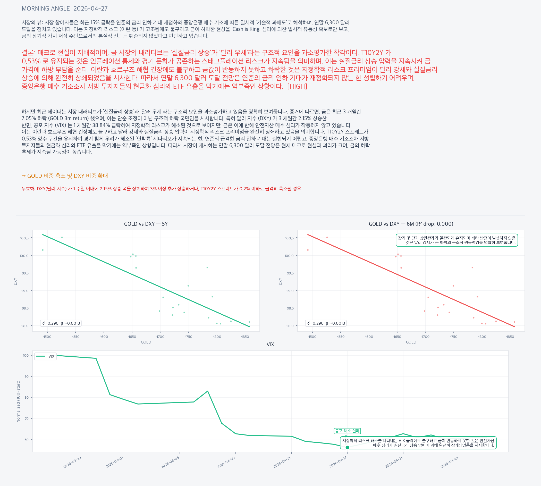 실질금리 상승 압력과 안전자산 (금) 수요 위축은 달러 강세를 부추기는 핵심 요인입니다. VIX 급락과 지정학적 리스크 소멸은 신흥국 자금의 미국 유입을 유도하며, T10Y2Y 양수 구간 유지는 연준의 급격한 금리 인하를 제한하여 달러의 상대적 수익률 우위를 지속시킵니다. 금 매도세로 발생한 자금이 달러로 전환될 가능성이 높습니다.