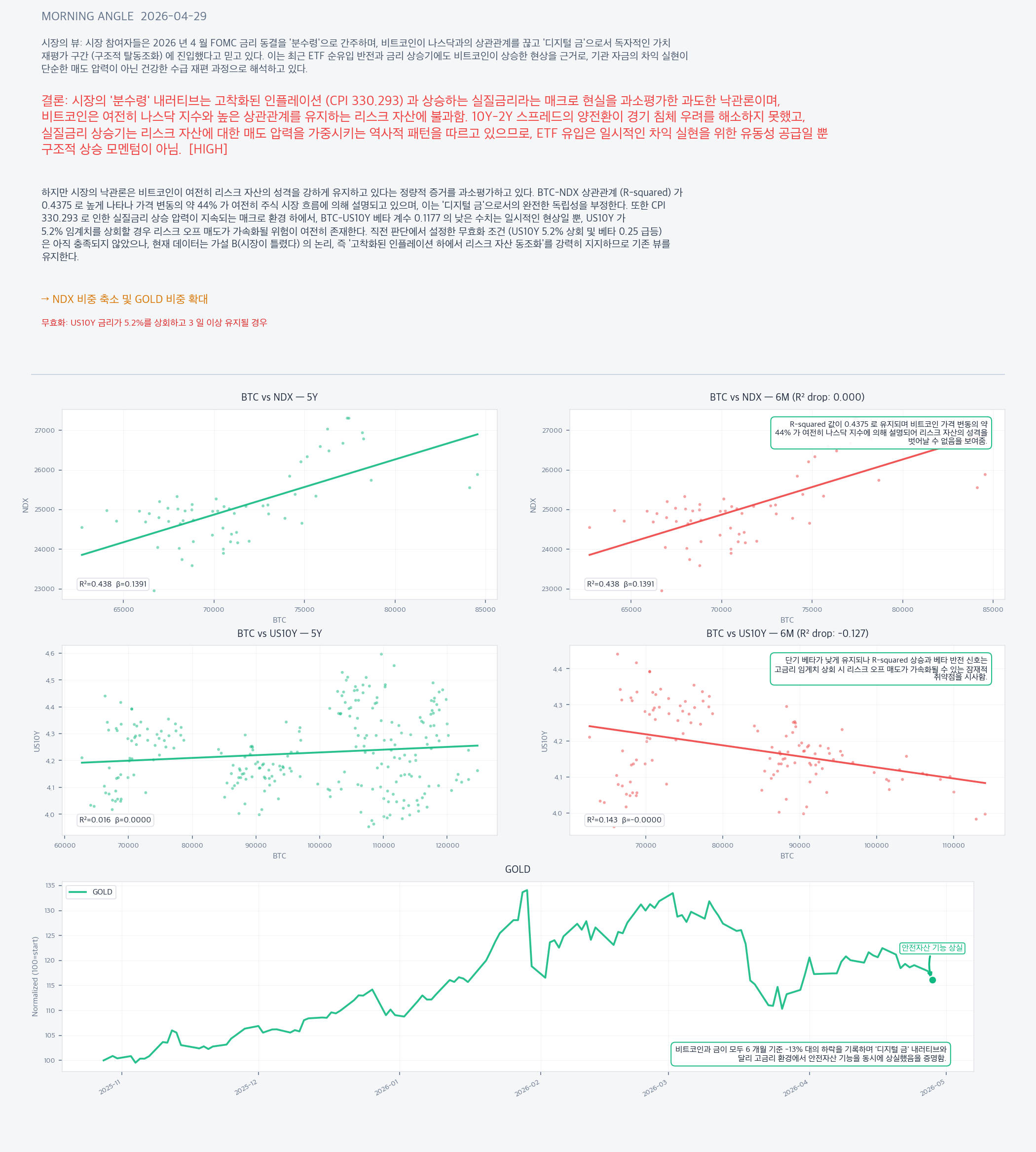 하지만 시장의 낙관론은 비트코인이 여전히 리스크 자산의 성격을 강하게 유지하고 있다는 정량적 증거를 과소평가하고 있다. BTC-NDX 상관관계 (R-squared) 가 0.4375 로 높게 나타나 가격 변동의 약 44% 가 여전히 주식 시장 흐름에 의해 설명되고 있으며, 이는 '디지털 금'으로서의 완전한 독립성을 부정한다. 또한 CPI 330.293 로 인한 실질금리 상승 압력이 지속되는 매크로 환경 하에서, BTC-US10Y 베타 계수 0.1177 의 낮은 수치는 일시적인 현상일 뿐, US10Y 가 5.2% 임계치를 상회할 경우 리스크 오프 매도가 가속화될 위험이 여전히 존재한다. 직전 판단에서 설정한 무효화 조건 (US10Y 5.2% 상회 및 베타 0.25 급등) 은 아직 충족되지 않았으나, 현재 데이터는 가설 B(시장이 틀렸다) 의 논리, 즉 '고착화된 인플레이션 하에서 리스크 자산 동조화'를 강력히 지지하므로 기존 뷰를 유지한다.