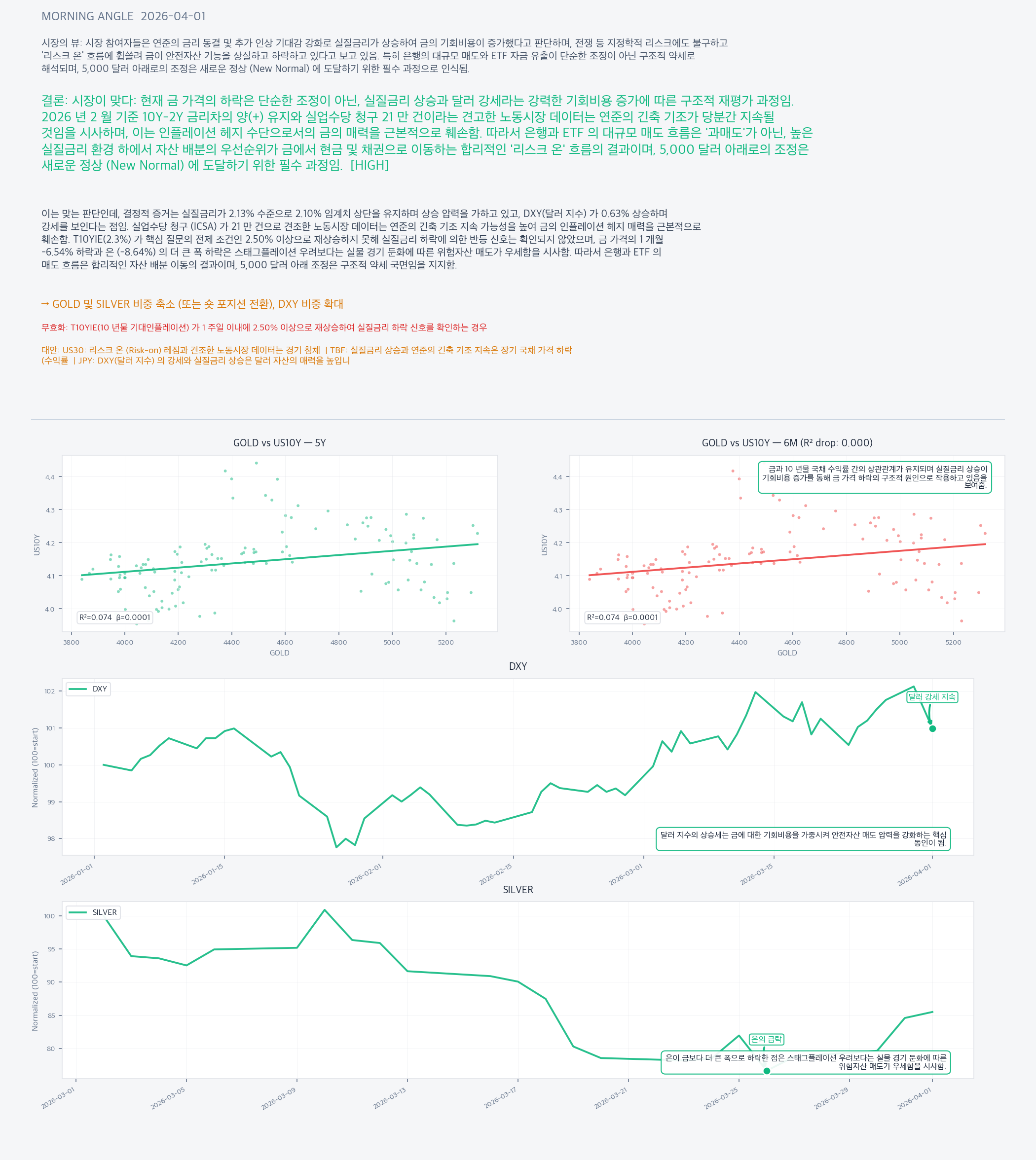 • 기술적/포지셔닝 리스크: GOLD-US10Y 상관관계 (R2) 의 비정상적 저조 (0.0741) 로 인해 금리 상승과 무관하게 중앙은행 매수나 물리적 수요로 인한 기술적 반등 발생 가능성